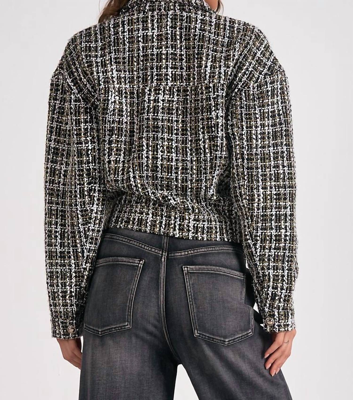 Eleve seu guarda-roupa com o Blazer Jaqueta Jazz Tweed da ELAN, uma peça chique e versátil com um design xadrez metálico preto marcante com dourado e branco. Este blazer de manga comprida é confeccionado inteiramente em 100% poliéster e possui um sofisticado fecho de botões. Ideal para adicionar um toque de brilho a qualquer conjunto, ele também inclui bolsos para maior funcionalidade. Cuide desta peça estilosa e marcante lavando-a à mão para manter sua textura elegante. A modelo tem 1,75 m, medidas de 86 cm de busto, 61 cm de cintura e 91 cm de quadril, e veste tamanho P.