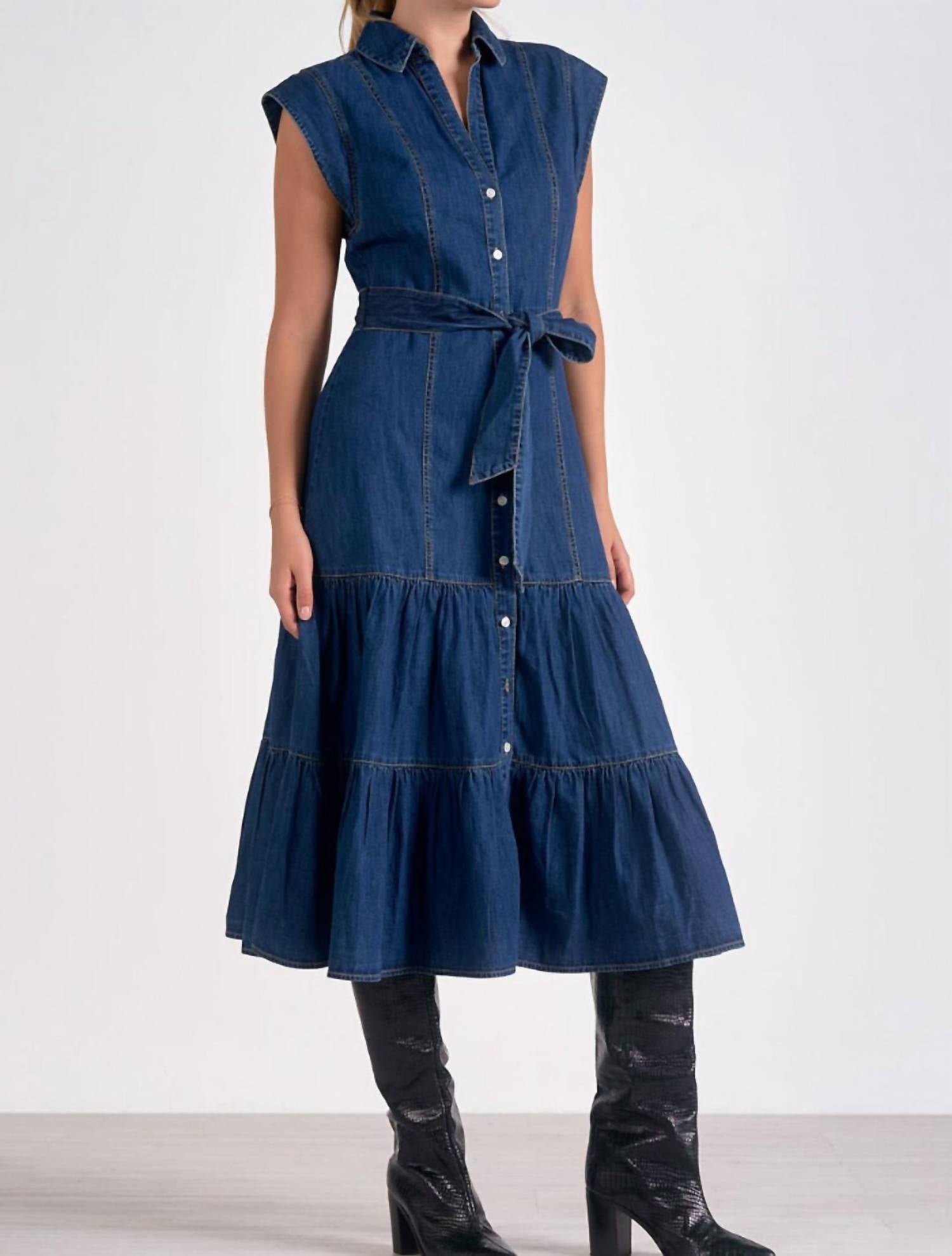 Eleve seu guarda-roupa com o Vestido Midi Jeans Elan Josepine em um tom azul atemporal. Desenhado para mulheres, este vestido apresenta mangas curtas, um caimento elegante e silhueta flare, confeccionado em cambraia de algodão leve com costuras contrastantes. O vestido tem gola clássica e fecho de botão para facilitar o uso, enquanto o cinto na cintura valoriza a silhueta. Perfeito para um look chique que equilibra nostalgia com um toque moderno.