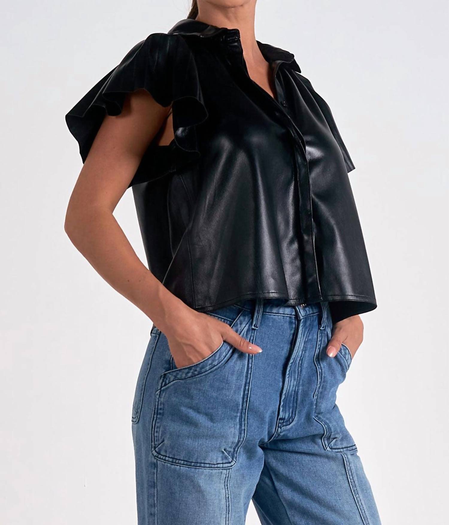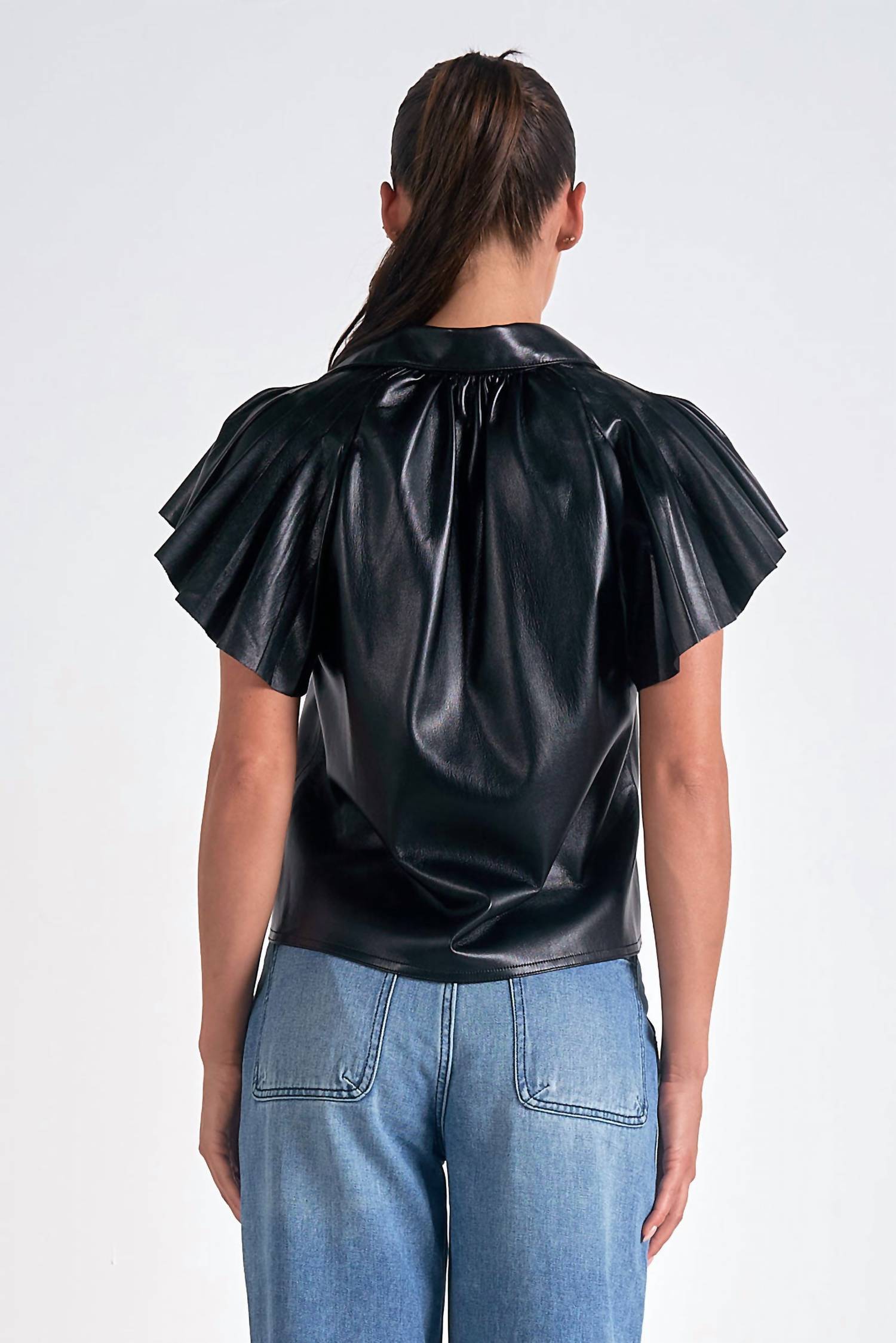 Uma blusa versátil que pode ser usada do escritório ao jantar! Apresentamos a Blusa de Couro com Mangas Flutter da ELAN, uma escolha sofisticada para quem ama um toque de glamour. Esta blusa possui mangas curtas e gola clássica, confeccionada em couro sintético brilhante em um tom preto elegante. Fechamento: O fecho de botão garante um ajuste confortável. Perfeito para adicionar um toque ousado e estiloso ao seu guarda-roupa.