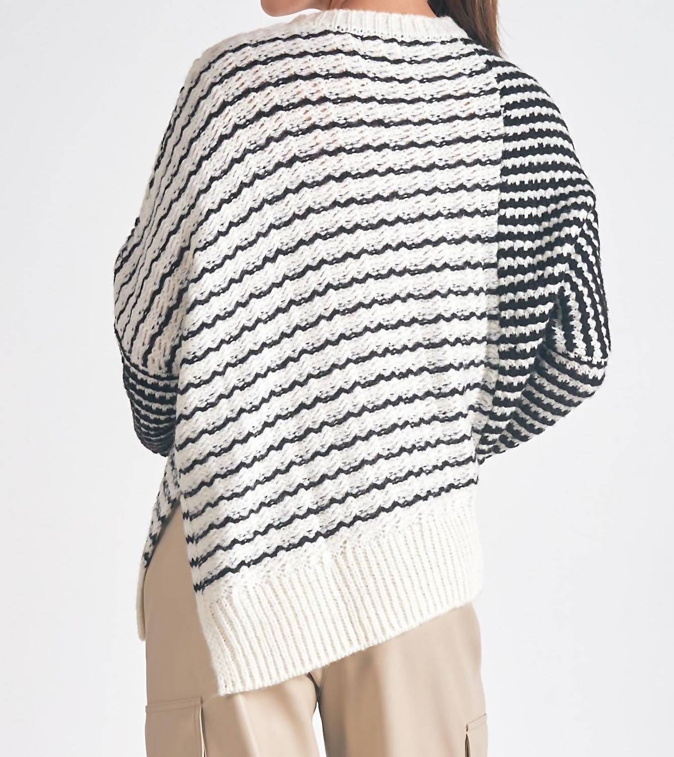 Experience the perfect blend of comfort and style with this trendy crew neck sweater, designed to effortlessly elevate your wardrobe. Pair it with your favorite denim and loafers for the perfect look. Discover the Mara Striped Sweater by ELAN, perfect for making a bold statement with its black and white asymmetrical stripes and color block design. Crafted with long sleeves, this sweater combines modern style and comfort using a composition of 47% Acrylic, 30% Nylon, 15% Wool, and 8% Mohair. This pull-on piece is ideal for any dinner party or Thanksgiving occasion, especially during the spring season, with its minimalist trend appeal. Featuring a crew neck design, it is both chic and versatile, ensuring you stand out effortlessly.