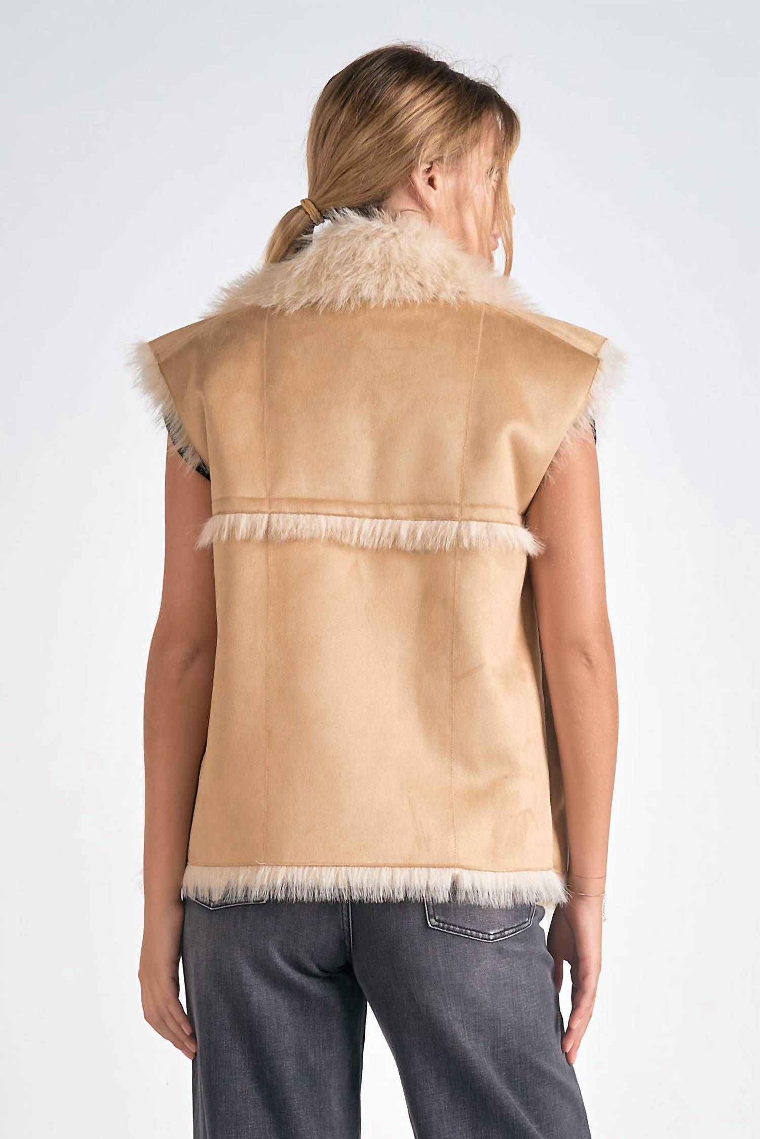 Um colete tão versátil que você pode misturá-lo e combiná-lo com quase qualquer roupa e ele parecerá novo em folha todas as vezes. Apresenta um design sem mangas com acabamento em pele sintética na gola, cavas e bainha. Confeccionada em tecido estruturado de camurça sintética para um visual elegante. Inclui fecho frontal com botão único para um ajuste seguro. Bainha reta com detalhes sutis de costura.