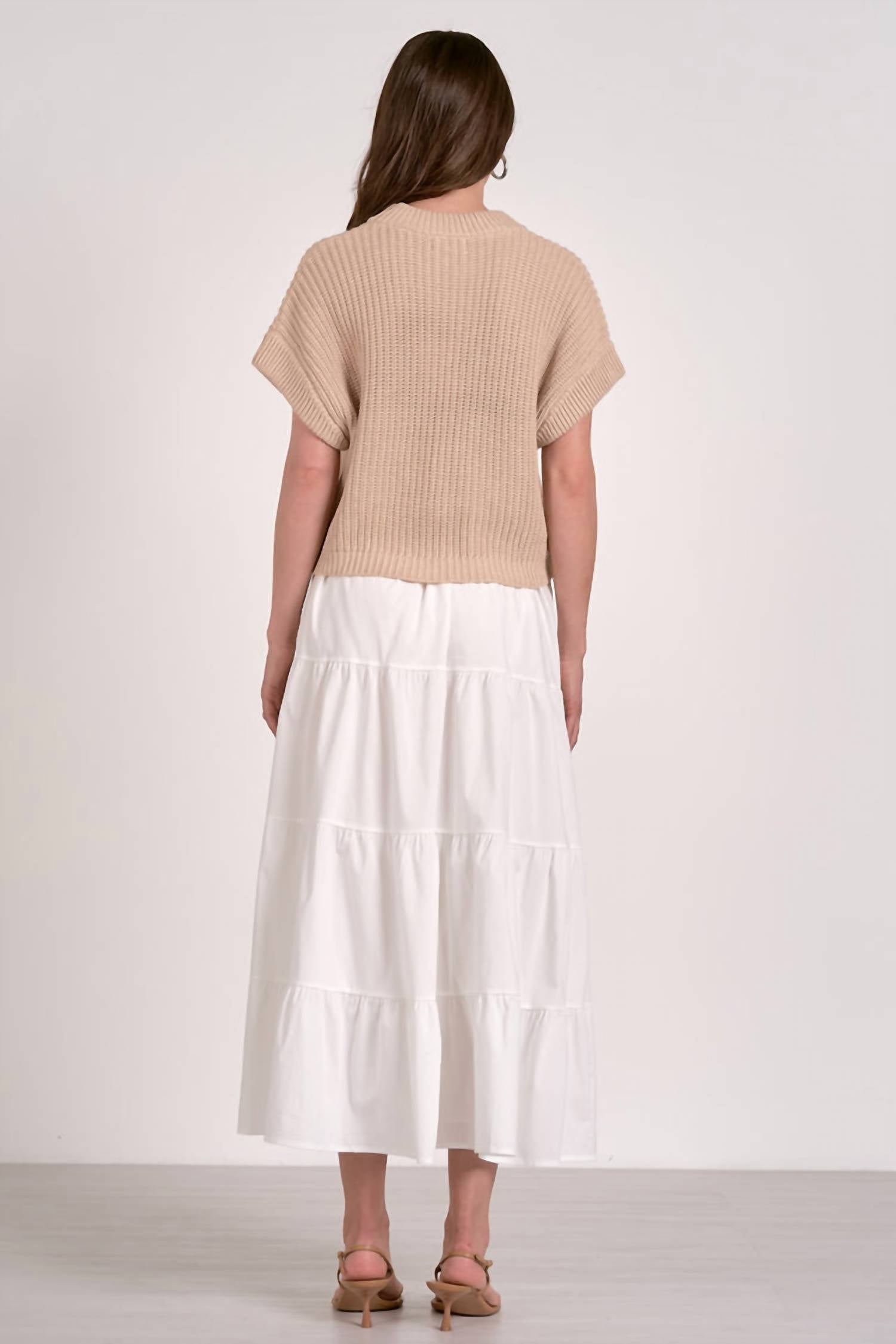 O vestido com o comprimento perfeito existe. Conheça o Vestido Midi Elan Opal Sweater, uma maravilha minimalista em um sofisticado conjunto branco-bege. Com mangas curtas e um corte em A elegante, este vestido é ideal tanto para ocasiões casuais quanto refinadas, como reuniões de Ação de Graças ou cultos religiosos. Com um fecho simples e gola redonda clássica, oferece estilo e conforto sem esforço durante todo o verão.