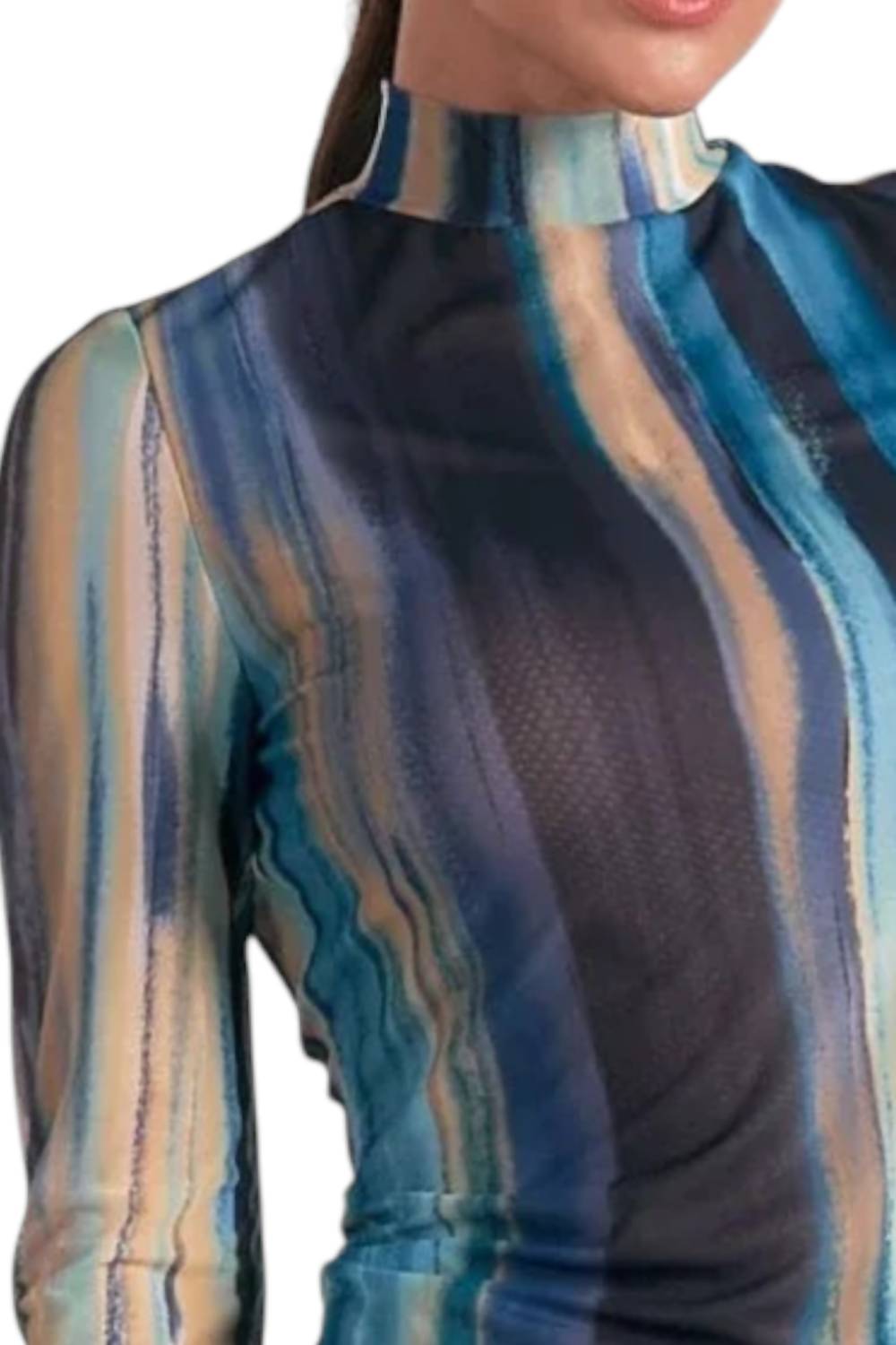 O Top de Malha Transparente com Estampa Oslo da ELAN é uma peça marcante para o seu guarda-roupa de outono e inverno. Confeccionado com mangas compridas e gola alta, este top azul multicolorido apresenta um corpete forrado e ajustado com mangas transparentes. Composto por 93% poliéster e 7% elastano, garante conforto e estilo. Projetado com fecho de puxar para facilitar, é ideal para lavar à mão e secar no varal.
