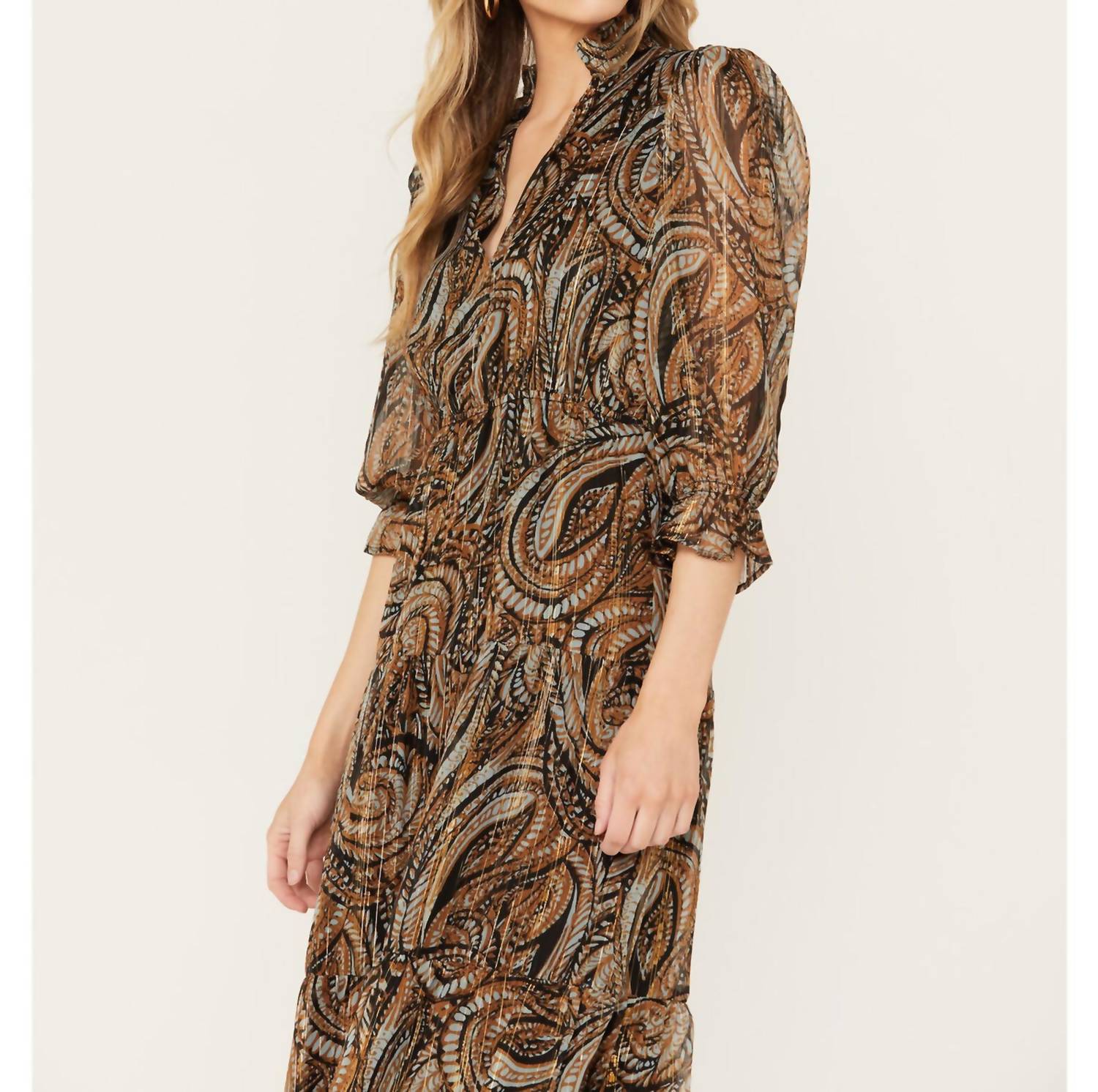 Um vestido midi tão versátil que suas opções de uso são infinitas. Estampa Paisley. Comprimento midi. Botões frontais. Caimento relaxado. Detalhes florais. A modelo veste tamanho pequeno. 100% poliéster. Gola alta franzida com decote em V. Preto com estampa paisley azul e marrom com detalhes dourados por toda a peça. Cintura elástica. Saia com 3 camadas. Lavagem à máquina com água fria, secagem em temperatura baixa. Importado.