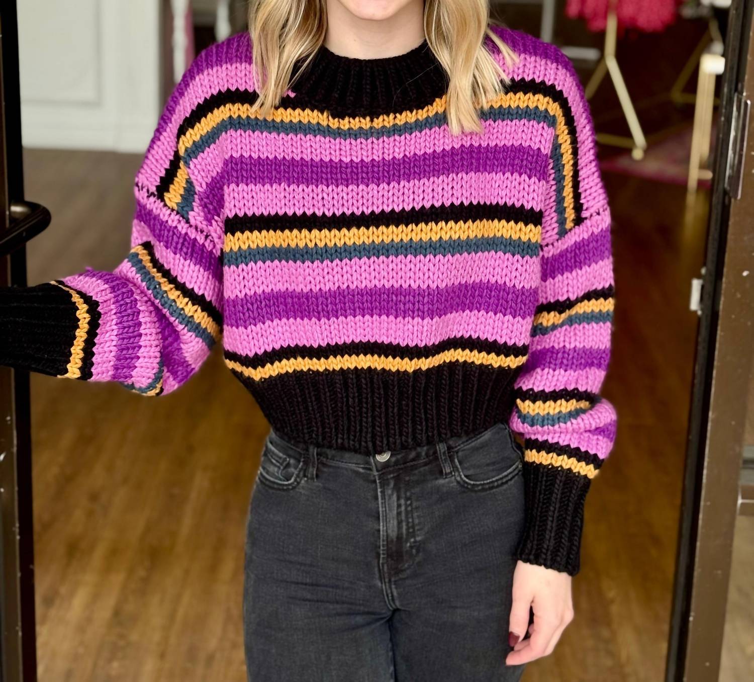 Apresentamos o Suéter de Manga Longa Pansy Stripe da ELAN, uma peça elegante e divertida em um tom roxo encantador. Este suéter feminino de gola redonda apresenta mangas compridas e um corte curto chique, adornado com listras coloridas que infundem diversão em qualquer look. Feito 100% em acrílico, possui um fecho de puxar confortável e requer lavagem à mão, com instruções para secar na horizontal. Perfeito para viagens e ideal para o outono, combine-o facilmente com jeans ou shorts para qualquer ocasião.