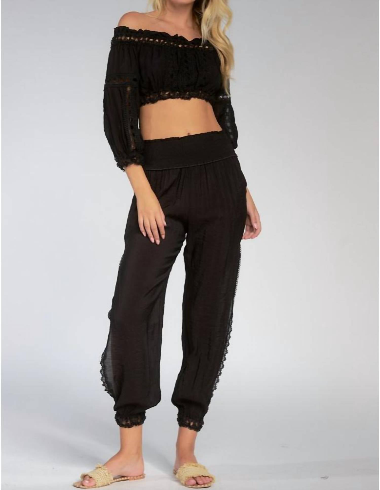 Calça de renda com fendas lateraisTecido50% Viscose/30% Poliéster/20% Poliamida
