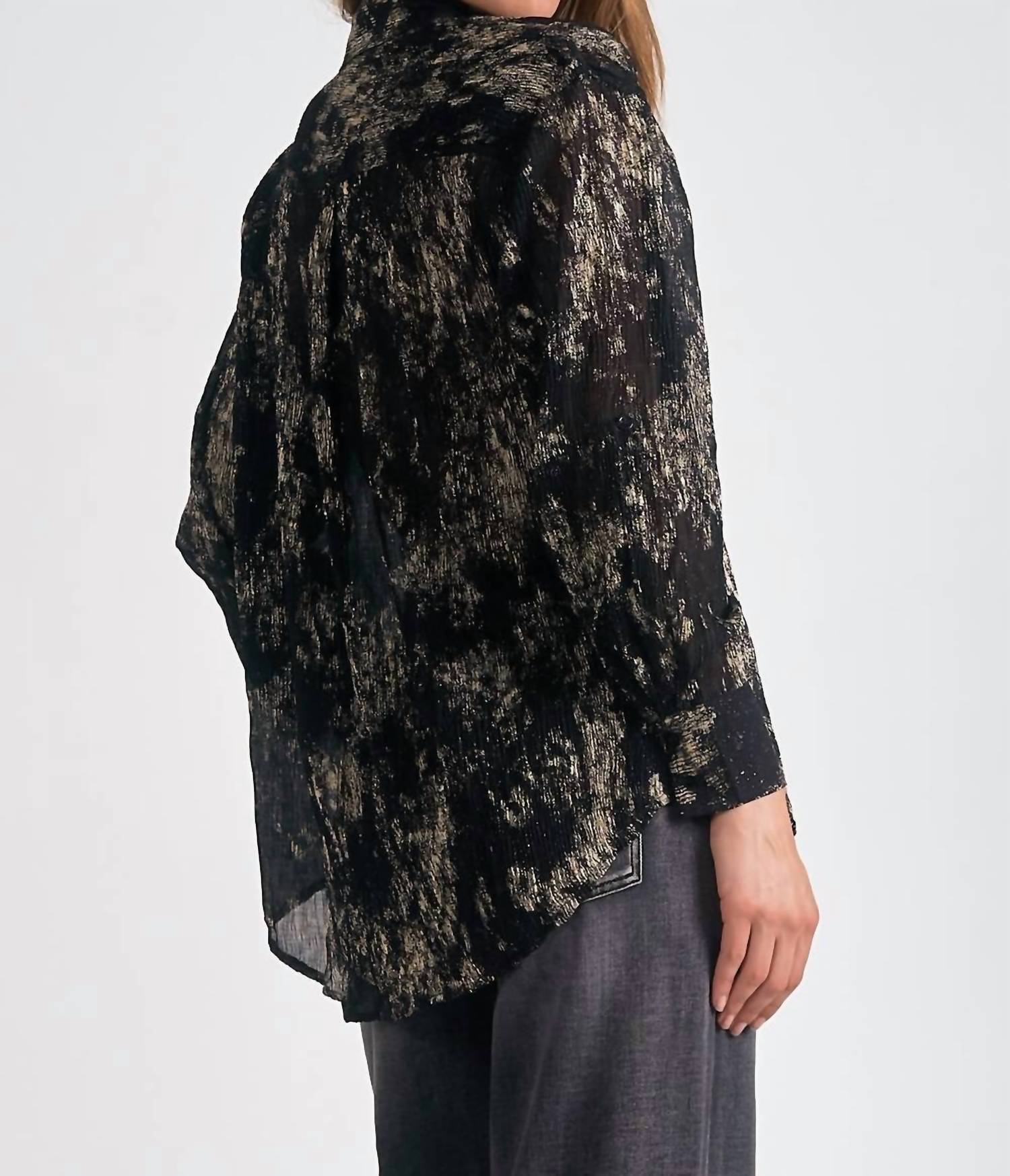 Uma blusa versátil que pode ser usada do escritório ao jantar! Apresentamos a Blusa Plissada de Manga Longa da ELAN, uma adição chique e sofisticada ao seu guarda-roupa. Esta blusa estampada apresenta mangas longas e um elegante decote em V, confeccionada em 100% poliéster. Perfeita para ocasiões de noivado e roupas de trabalho, ela vem em uma cor marcante, Preto/Dourado. O fechamento é por botão, tornando-a estilosa e prática para suas necessidades de moda primavera.