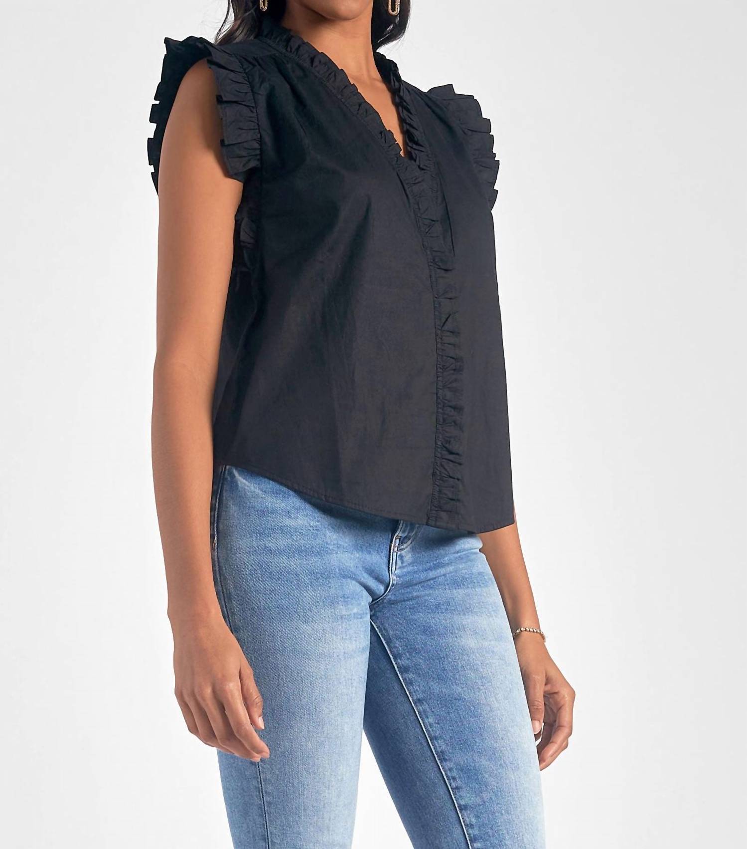 Uma blusa atemporal que nunca sai de moda. Sem mangas. Decote em V com detalhe de babados. Blusa. Caimento relaxado.