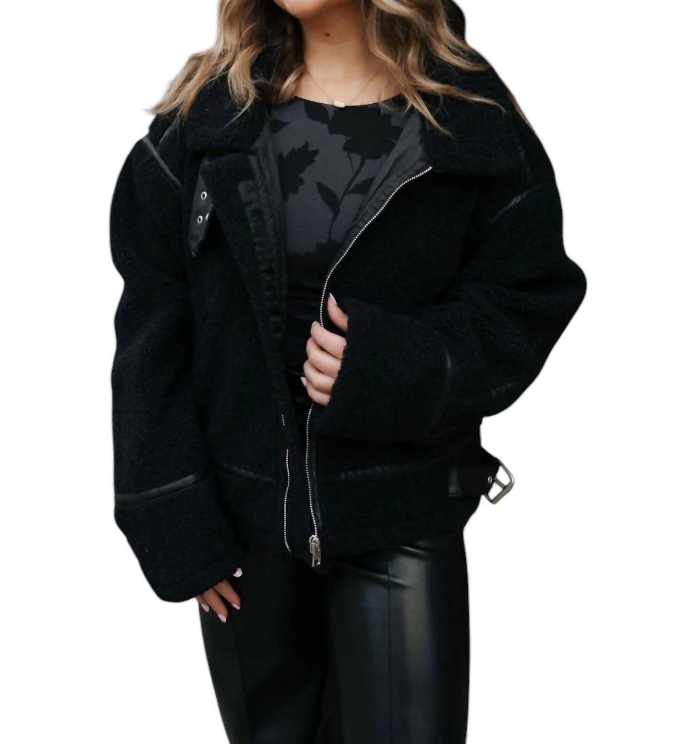 Não há nada mais legal do que esta jaqueta bomber de inspiração vintage. Mangas compridas elegantes com acabamento em camurça sintética. Confeccionada em uma mistura de lã macia e confortável. Possui gola careca e modelagem oversized. Bolsos laterais aparentes. Feita com fecho de zíper e detalhes em fivela motociclista prateada para um acabamento ousado. Silhueta oversized que você vai adorar.