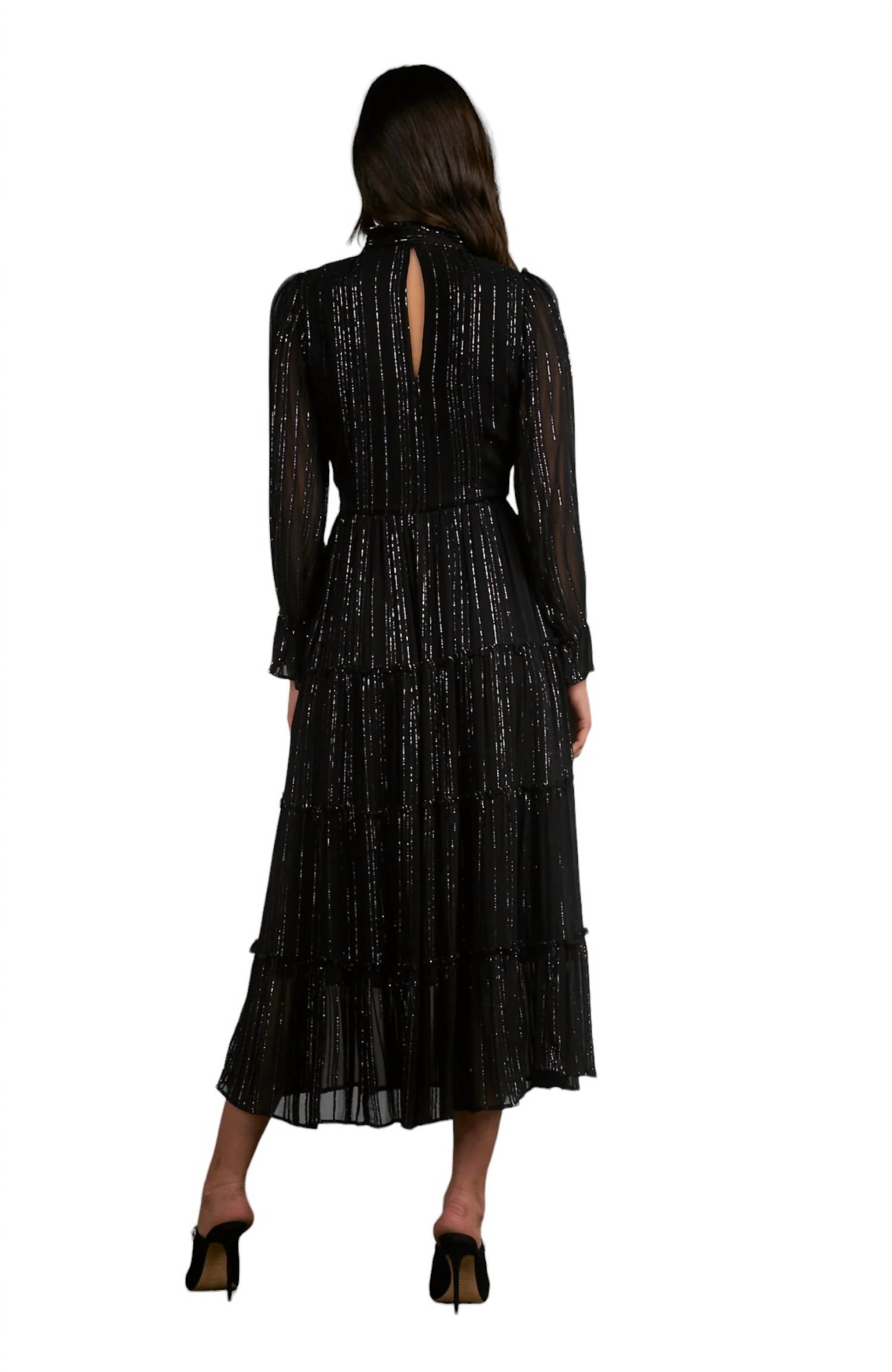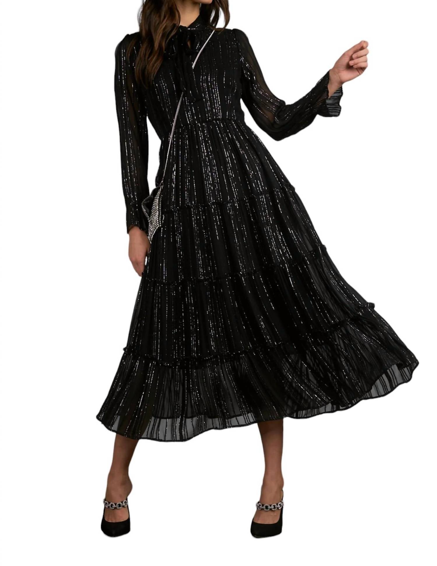 Um vestido longo que é tão fofo quanto confortável. Este vestido longo listrado com brilho apresenta manga comprida, amarração frontal no pescoço e cintura marcada.