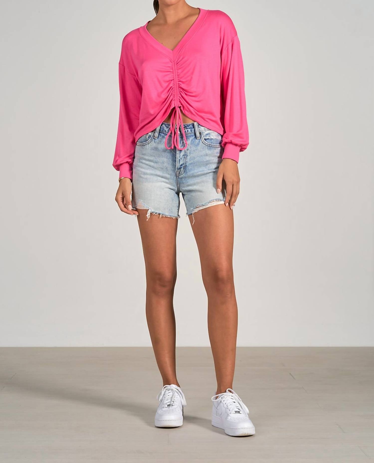 Caimento perfeito, design fofo, tecido macio. Você vai adorar tudo nesta camiseta de manga comprida. Camiseta de manga comprida com decote em V e franzido frontal.