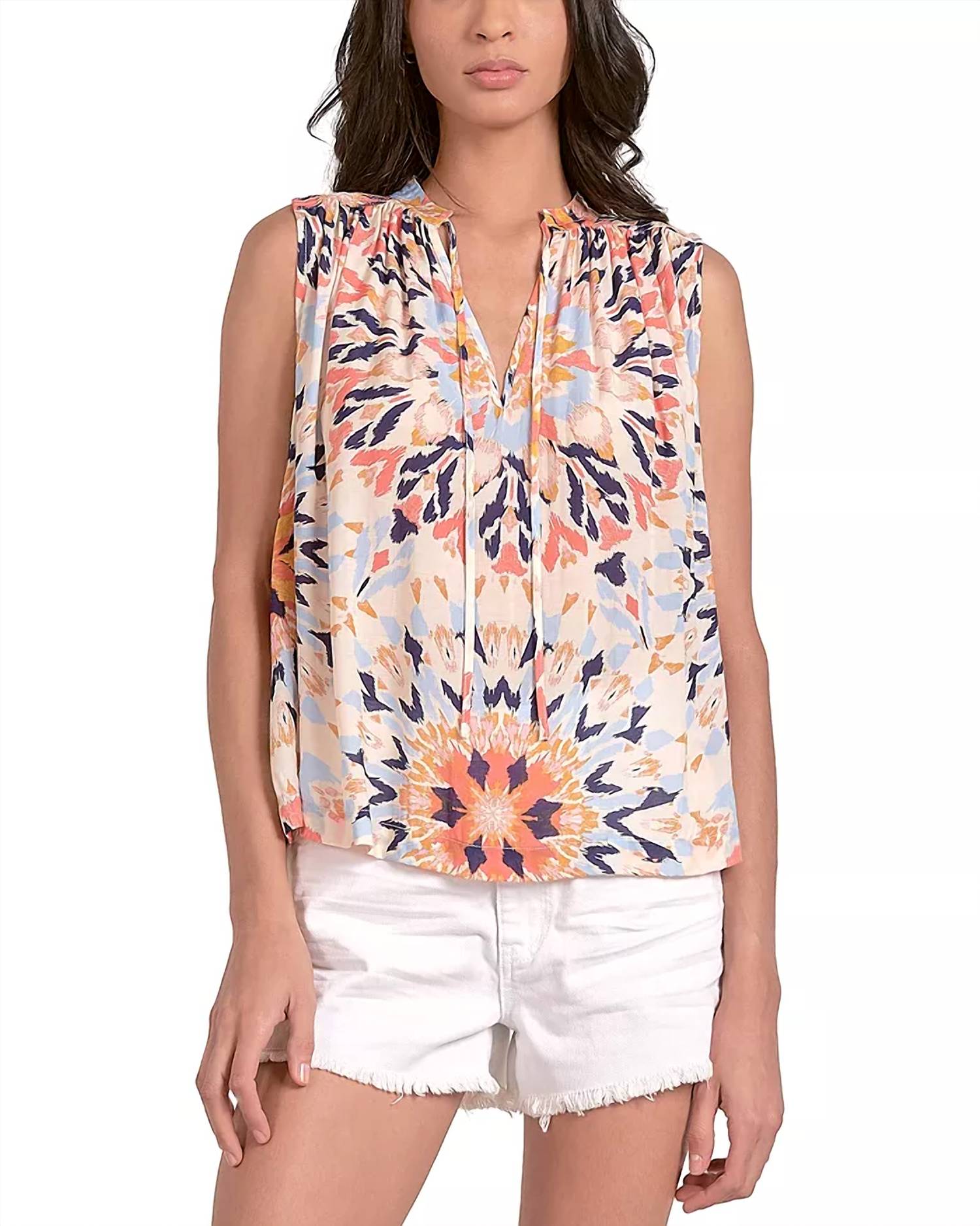 A versatile blouse that works from desk to dinner! Embrace effortless elegance with the ELAN Sleeveless Flowy Top, perfect for summer getaways or festive occasions. This vibrant multi-colored blouse features a whimsical allover print and a split V-neck with charming ties. Crafted from premium viscose in a relaxed, pullover style, it ensures comfort and style. Care is simple with a hand wash and line dry.