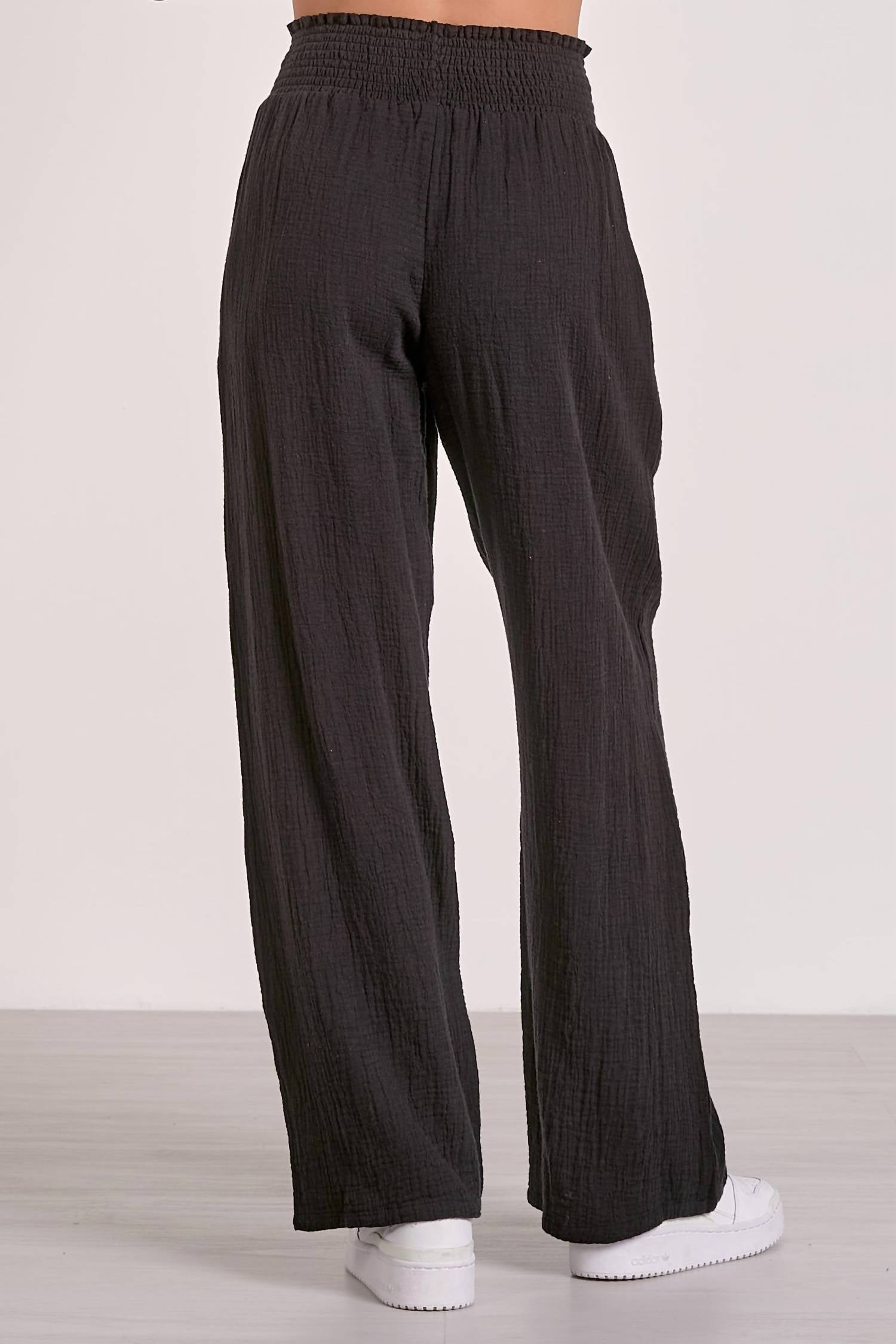 Eleve seu guarda-roupa casual com a Calça ELAN Smocked Waistband na cor preta, com cintura alta, estilo descontraído e pernas largas, confeccionada em algodão respirável. Esta calça feminina apresenta um padrão texturizado e oferece um caimento elegante com cós elástico franzido e bolsos práticos. Feita para ser prática, possui fecho de puxar e é perfeita para looks de férias ou streetwear. O cuidado é simples: lave na máquina com água fria no ciclo delicado. Projetada para conforto e estilo sem esforço.