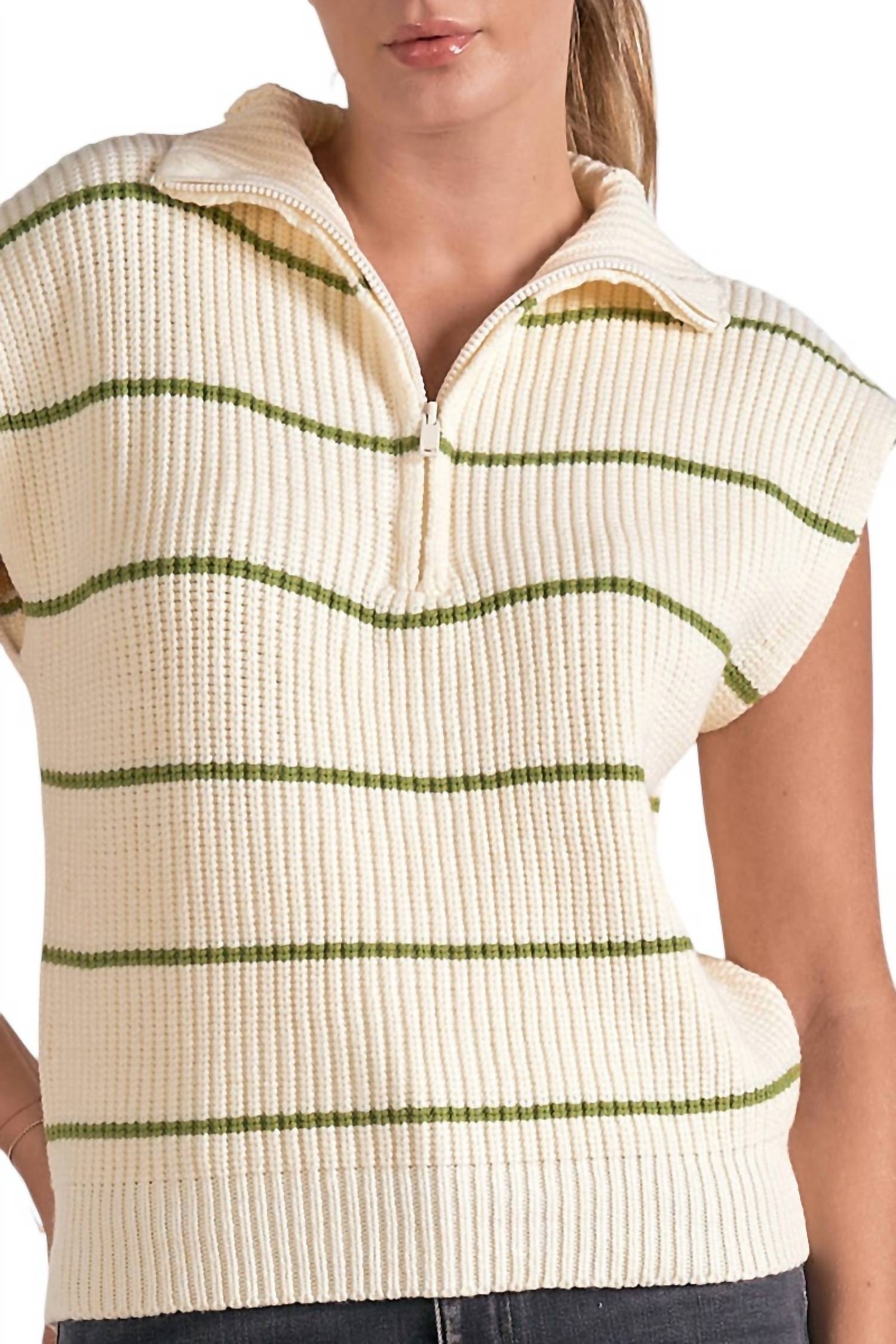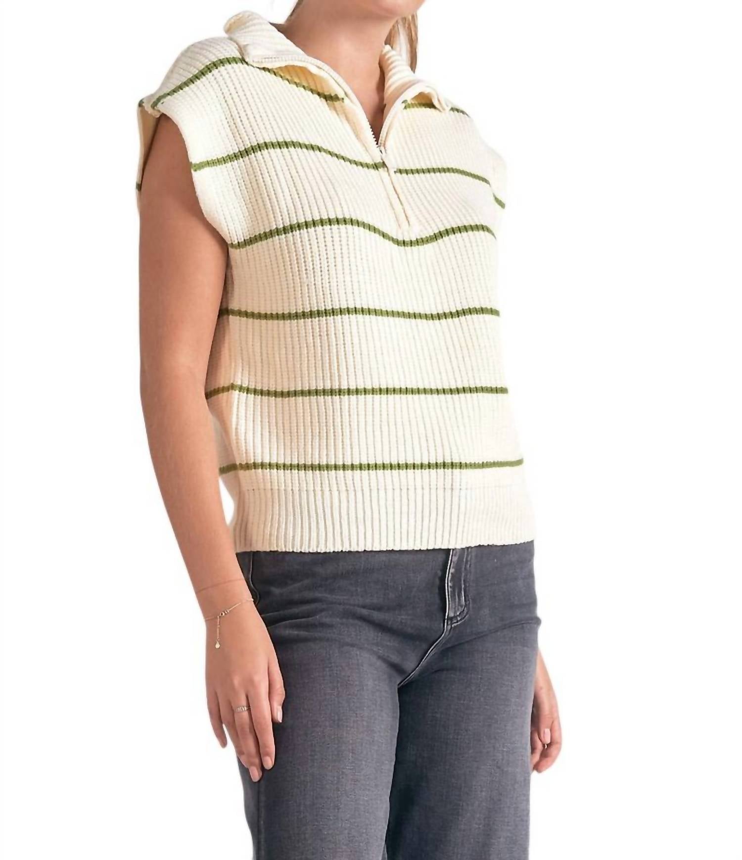 Apresentamos o Suéter Listrado com Zíper Frontal da ELAN, onde o design lúdico se mistura perfeitamente com o estilo clássico. Este suéter sem mangas apresenta listras bege e verde e é confeccionado em viscose luxuosa. O suéter possui uma gola elegante e inclui um prático fecho de zíper.