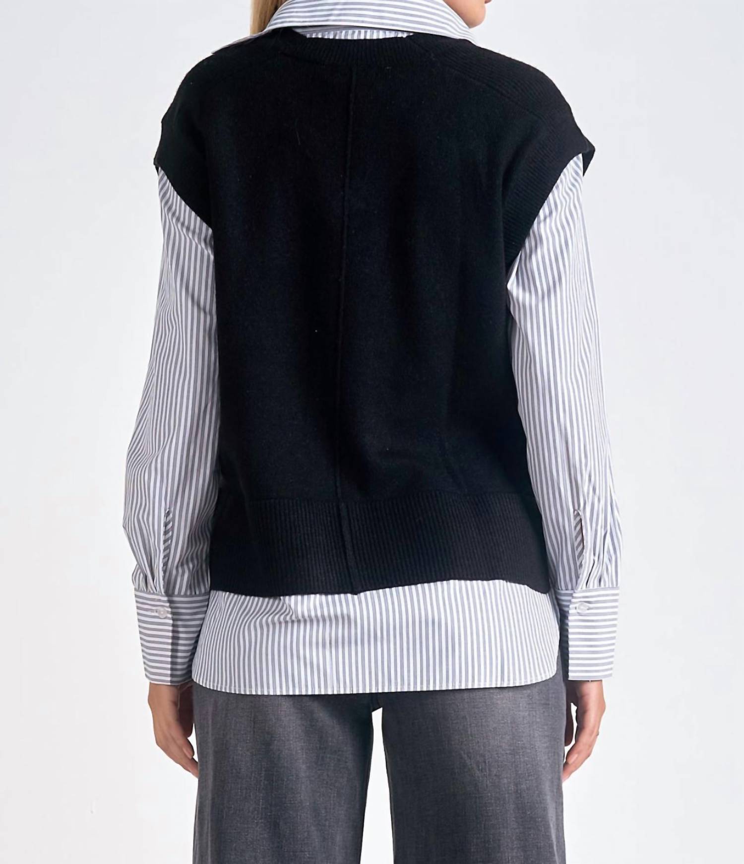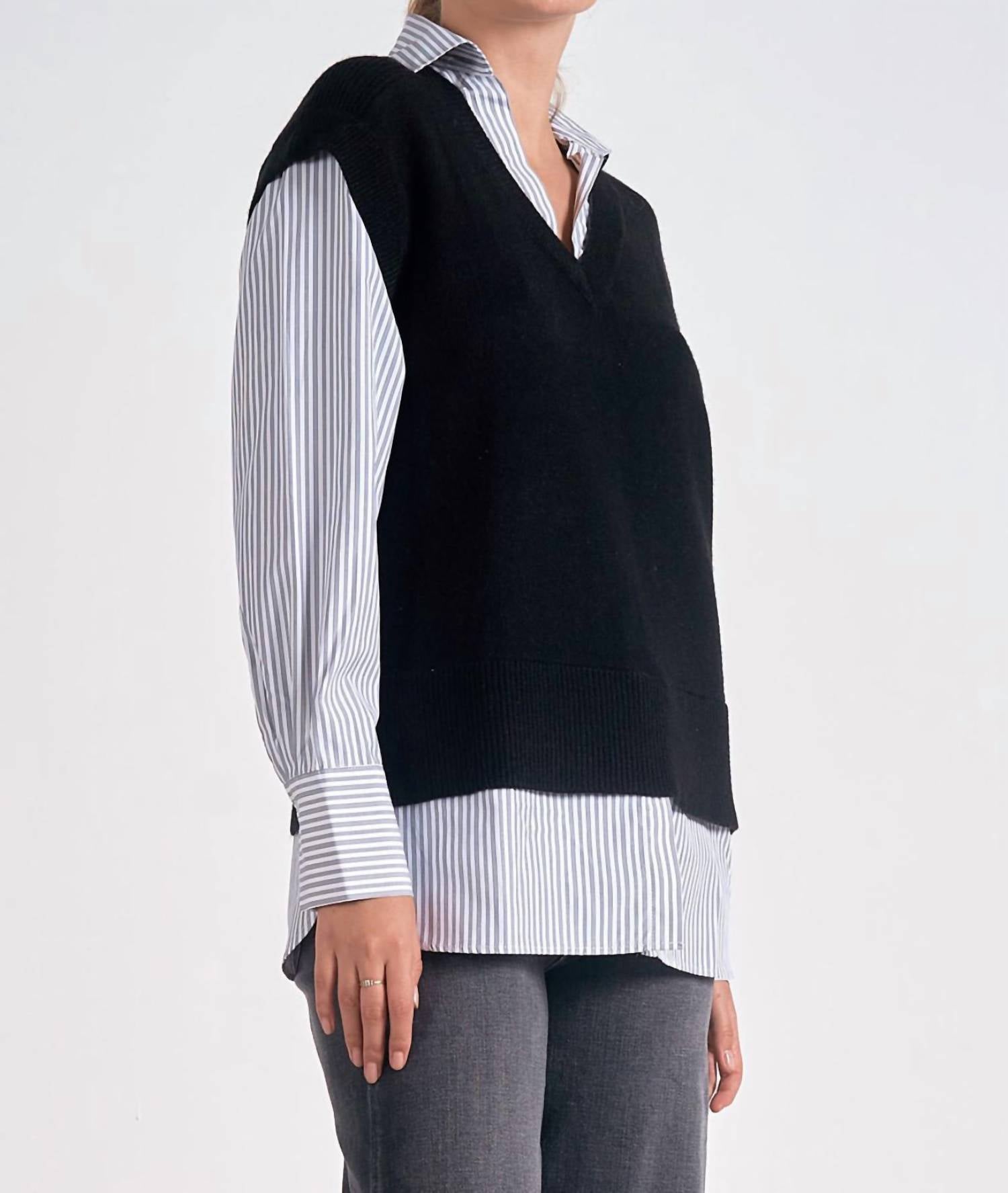 Um colete tão versátil que você pode misturá-lo e combiná-lo com quase qualquer roupa e ele parecerá novo em folha todas as vezes. Apresentamos o Yves Sweater Top da ELAN, uma mistura sofisticada do clássico risca de giz com um elegante suéter azul-marinho, perfeito para qualquer ocasião. Este top de manga comprida apresenta um decote com gola, transitando perfeitamente do elegante ao casual. O Tecido 1 é composto por 64% acrílico, 26% poliéster, 10% nylon e o Tecido 2 é 100% algodão para máximo conforto. O fecho pull-on aumenta a praticidade, sendo ideal para mulheres que buscam um estilo versátil.