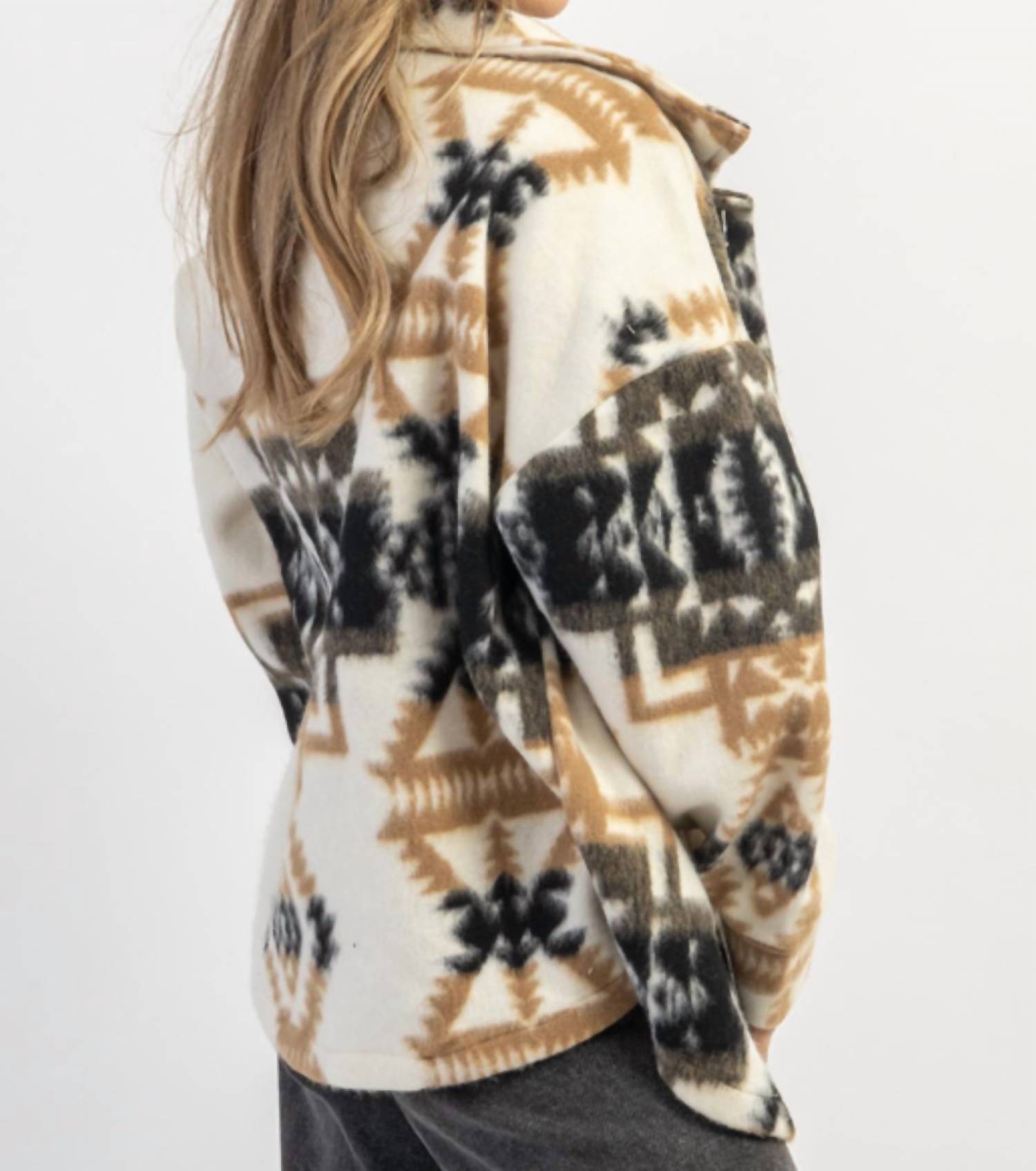 Bonita, casual e confortável. Esta jaqueta é um item essencial. Modelagem oversized, sherpa por toda a peça com estampa contrastante asteca, botões frontais, gola e bolsos laterais. 100% poliéster. A modelo veste tamanho P. Altura 1,73 m.