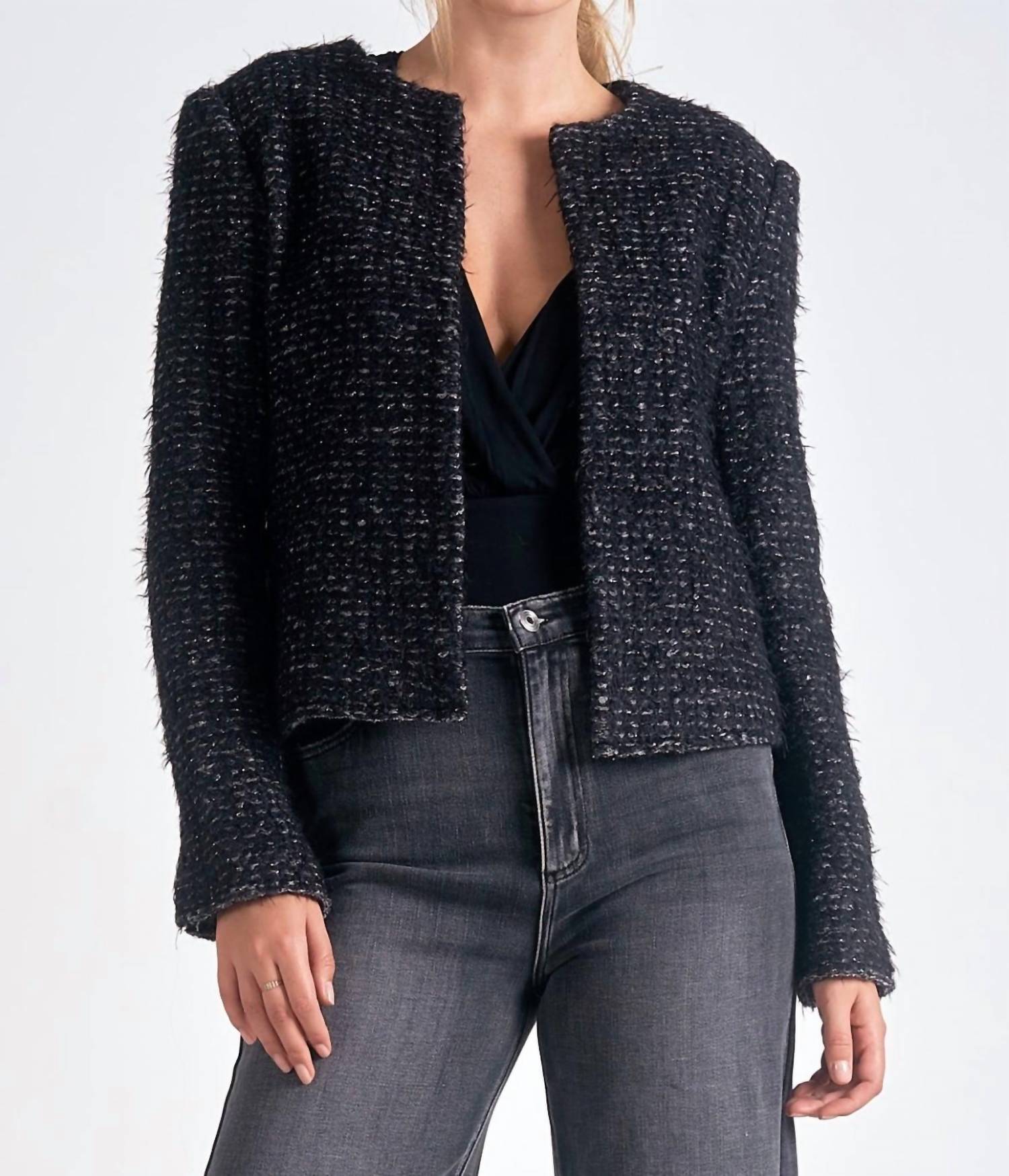 Bonita, casual e confortável. Esta jaqueta é um item essencial. Apresentamos a Jaqueta Cropped Estruturada Elan Tweed, uma adição chique ao seu guarda-roupa de fim de ano. Esta jaqueta apresenta mangas compridas e um design estruturado e cropped em tweed texturizado preto e prata com detalhes em lurex. Sua composição em 44% lã, 44% poliéster, 10% acrílico e 2% lurex garante conforto e estilo, perfeita para usar sobre jeans ou conjuntos elegantes de fim de ano. O fecho é prático e prático, com instruções de cuidado que recomendam lavagem a seco para manter seu visual sofisticado.