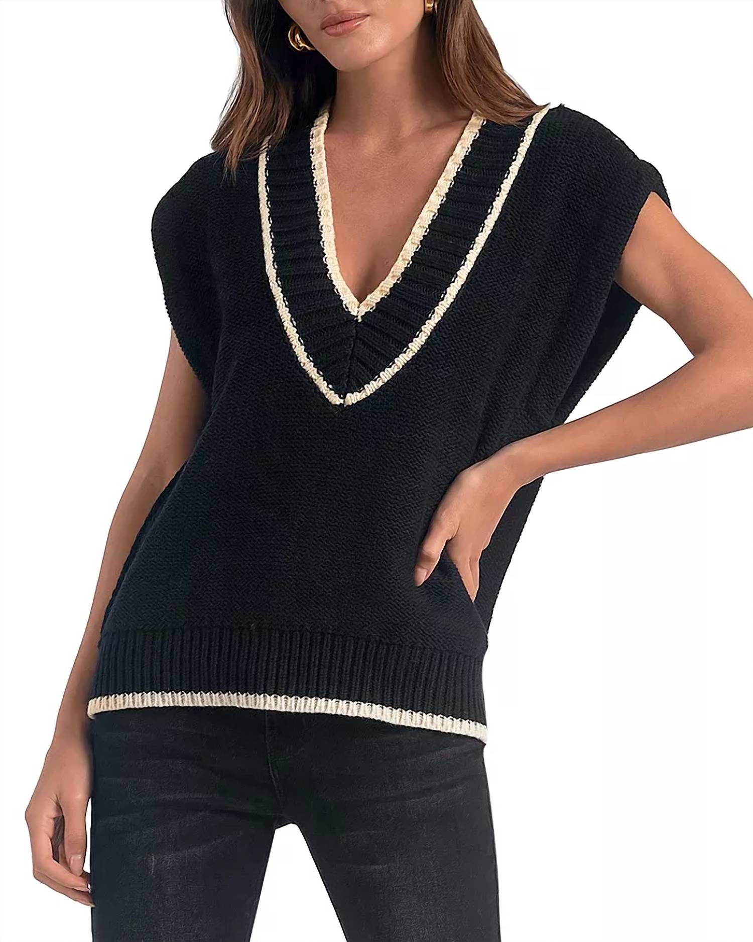 Eleve seu estilo com o colete suéter ELAN com decote em V na cor preta, elegante e projetado para mulheres que apreciam um visual texturizado sofisticado. Este colete sem mangas apresenta decote em V e acabamento canelado no pescoço e na bainha, adicionando detalhes clássicos ao seu look. Confeccionado em uma mistura de algodão (55% algodão e 45% acrílico), promete conforto e facilidade de vestir. Importado e com tamanho padrão, recomenda-se lavar à mão com cuidado. A modelo veste tamanho P, mede 1,78 m, mede 85 cm de busto, 59 cm de cintura e 87 cm de quadril.