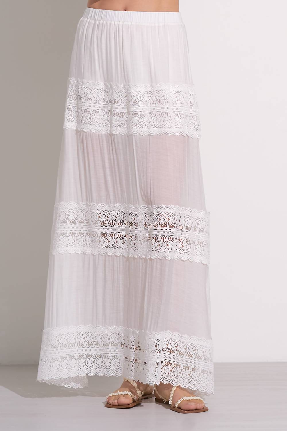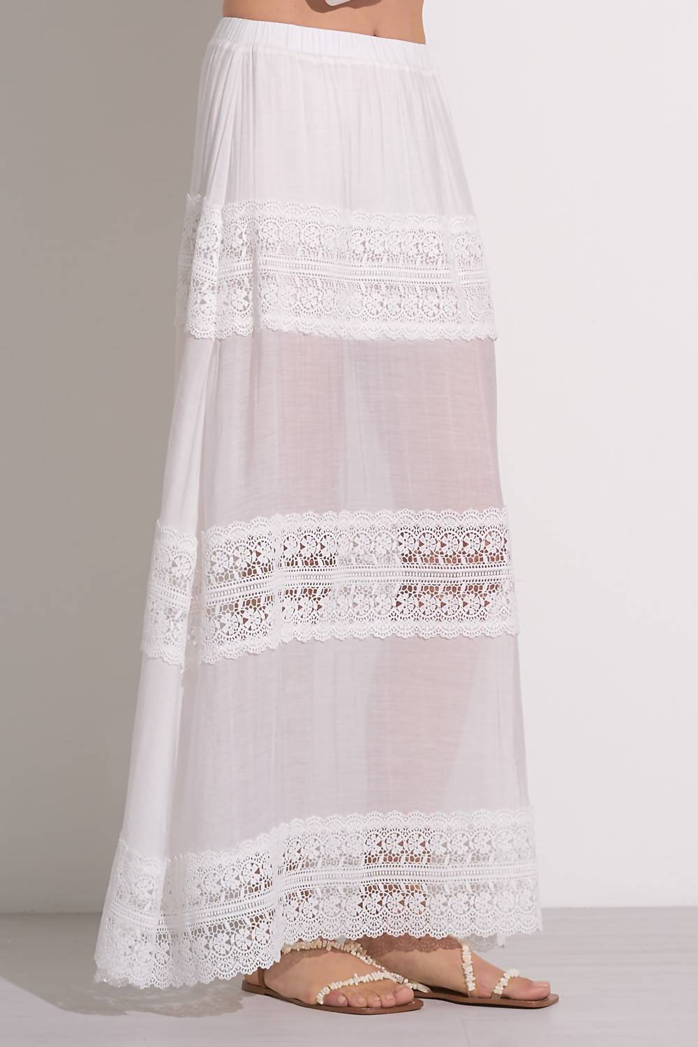 Vista sua camiseta favorita para um visual mais casual, porém feminino. Apresentamos a Saia Vera da ELAN, um sonho boho chic perfeito para resorts e dias de praia. Esta saia longa texturizada em branco apresenta detalhes em crochê para um visual elegante e feminino. Confeccionada em uma mistura de viscose (50% viscose, 30% poliéster, 20% poliamida) com forro 100% poliéster, ela foi desenvolvida para conforto e estilo. Com um fecho fácil de calçar, esta peça atemporal é um item essencial para a primavera.
