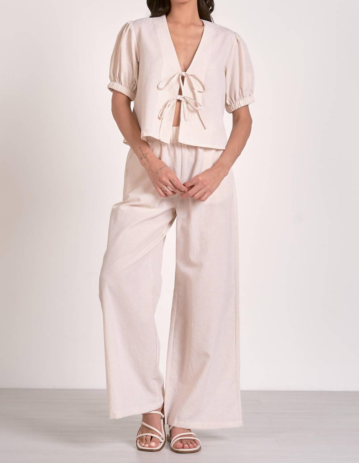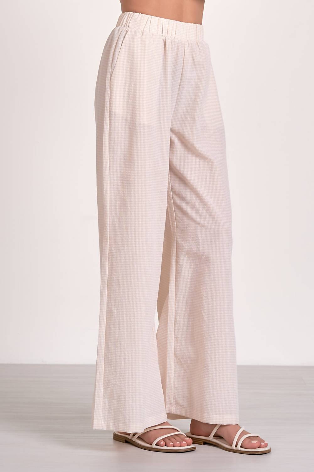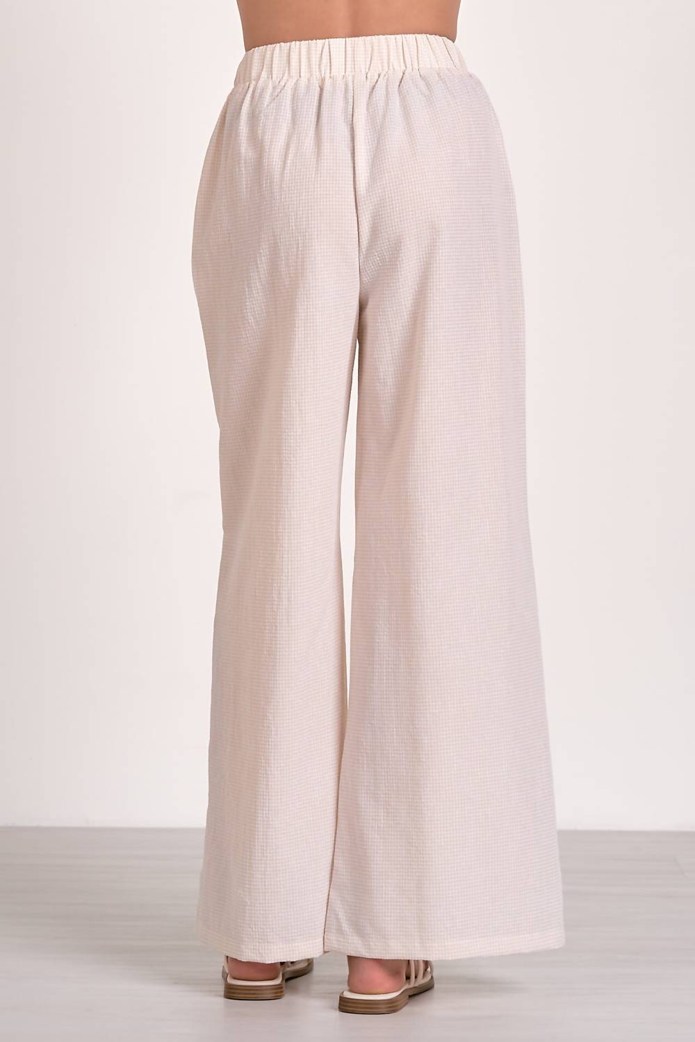 Experience effortless style with the ELAN Vita Wide Leg Pants, perfect for staying cool and relaxed this summer. These women’s pants feature a mid-rise, wide-leg design and are crafted from a tan seersucker blend of 70% polyester and 30% cotton. The pull-on closure and elastic waistband offer both comfort and ease. They are machine washable and can be tumble dried, making them ideal for minimalist vacation wear.