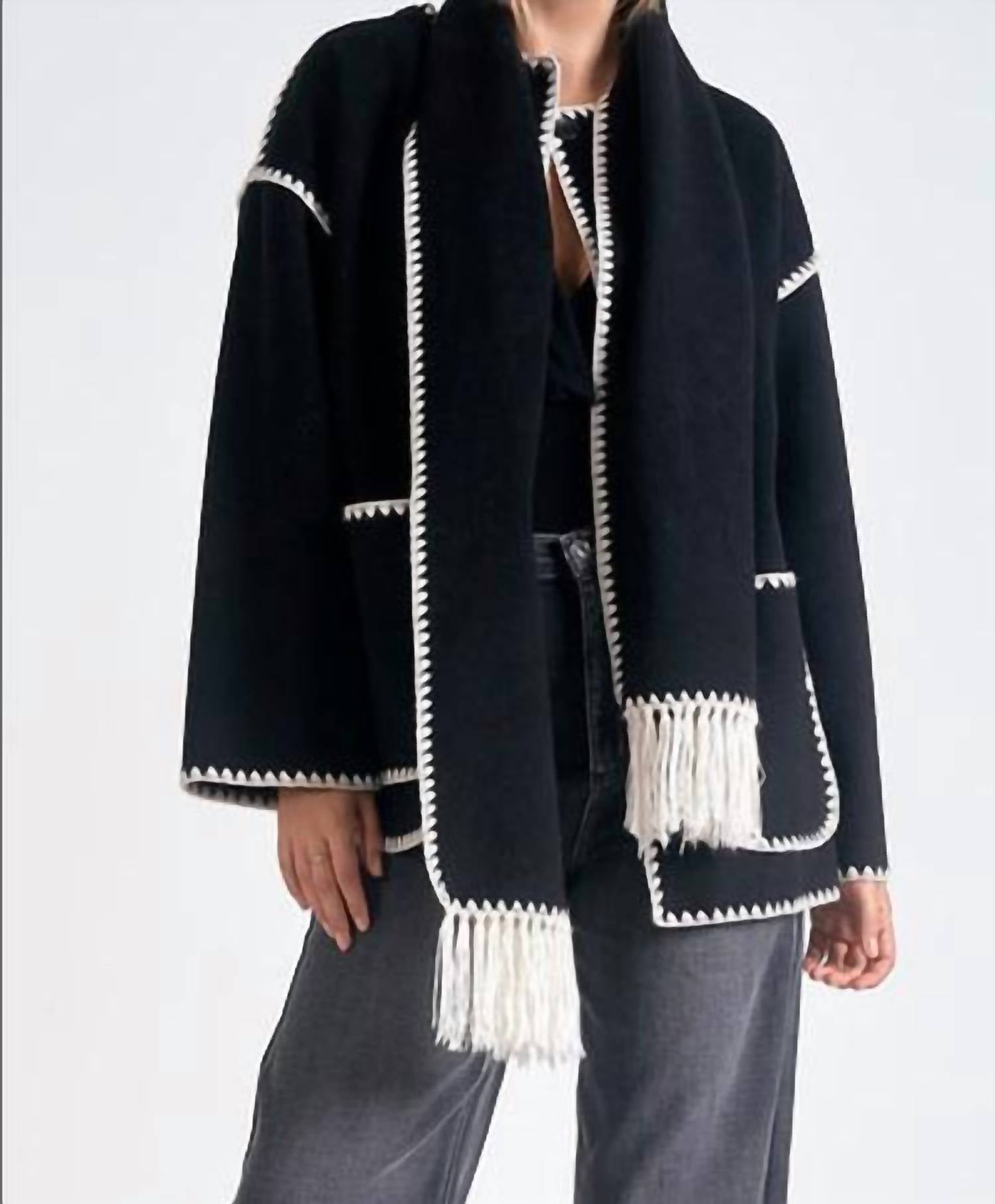 Eleve seu guarda-roupa com a Jaqueta Whip Stitch da ELAN, uma peça casual estilosa, perfeita para qualquer ocasião. Esta jaqueta preta apresenta costuras em chicote e franjas em tom marfim, complementadas por um cachecol removível para um estilo versátil. O design inclui mangas compridas e um prático fecho de botão, tudo confeccionado com uma silhueta elegante de gola redonda. Completa com bolsos, esta jaqueta combina funcionalidade e estilo sem esforço, sendo a escolha ideal para um uso chique no dia a dia.