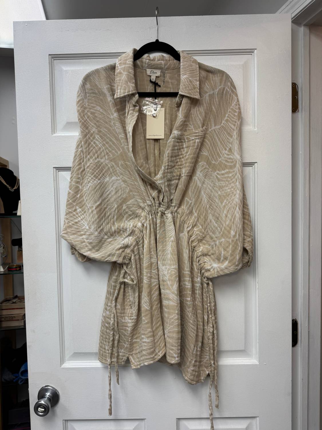 Embrace boho chic with the Women's Adjustable Waist Band Dress by ELAN, a perfect addition for your fall wardrobe. This mini dress features long sleeves and a wrap silhouette that effortlessly flatters, with a stylish collar neckline. The patterned design comes in a versatile beige hue, perfect for a vacation getaway. Closure: Tie closure.