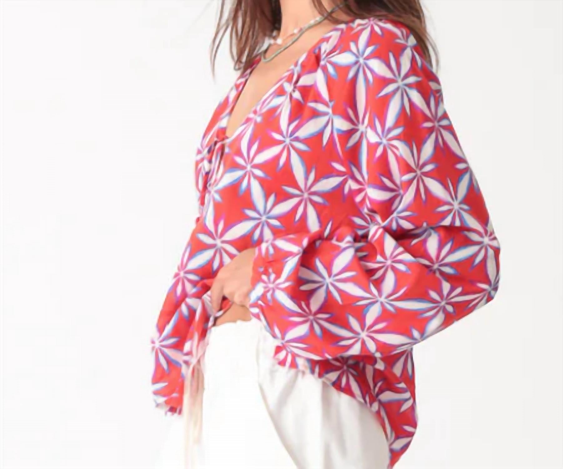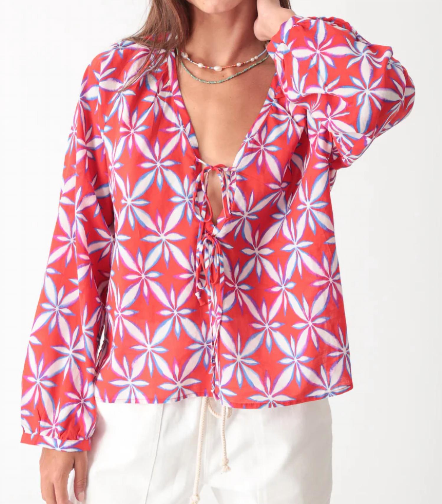 Uma blusa versátil que pode ser usada do escritório ao jantar! Conheça o Top Meridian Tie Feminino da Electric & Rose, um complemento perfeito para o seu guarda-roupa de férias. Esta blusa possui mangas compridas e um fecho de gravata chique, personalizado em tom cereja para um toque de cor. Confeccionado com maestria em uma mistura de algodão de 50% Tencel, 45% Algodão e 5% Elastano, o top oferece um caimento confortável e relaxado. Com seu design estampado e maximalista e decote em V, este item essencial para o verão traz detalhes sofisticados ao estilo casual.