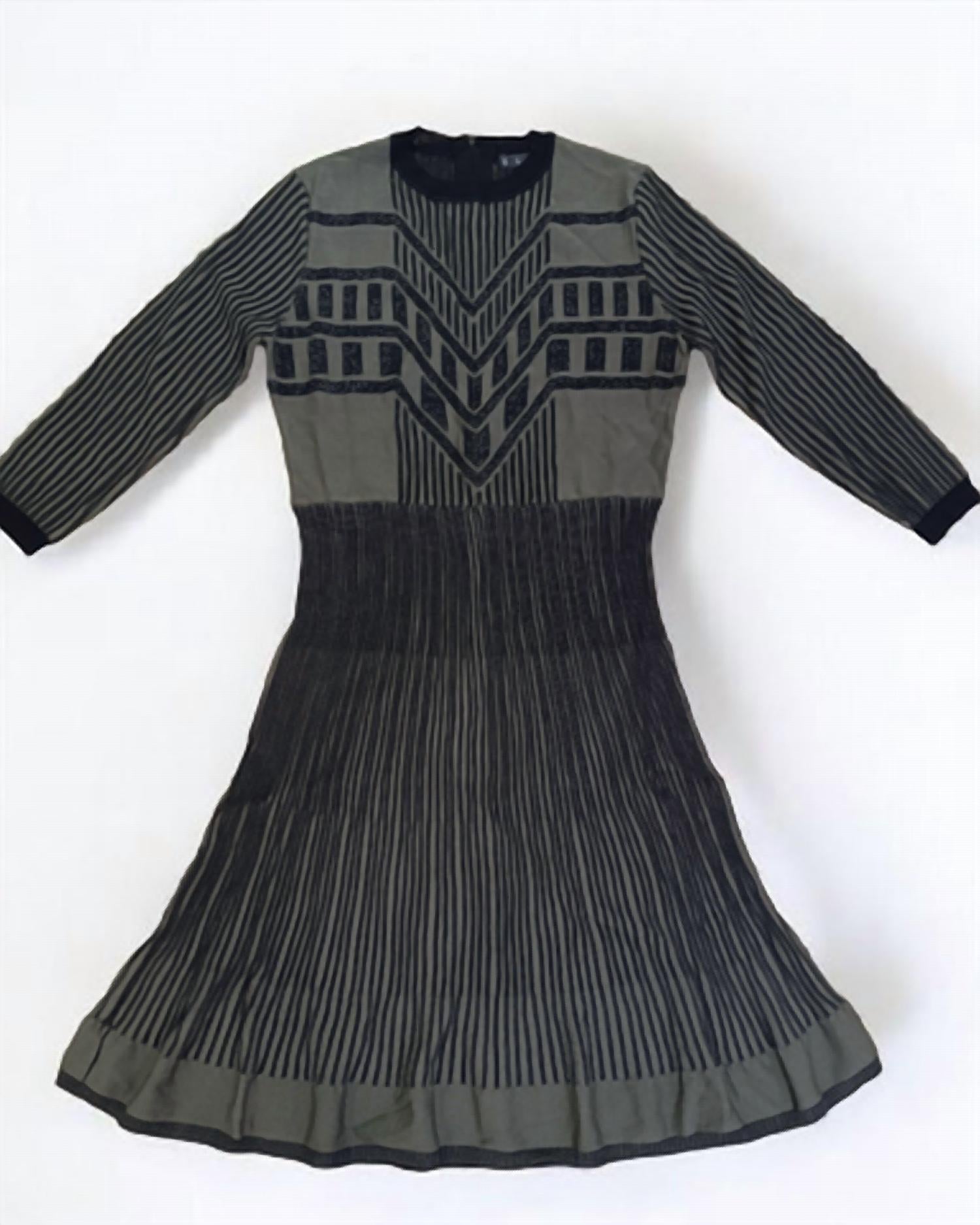 Just add slides or mules and you are good to go. Introducing the Elio Textured Knit Dress, a chic midi dress in versatile Black/Olive designed for effortless workwear and church occasions. This women's A-line silhouette features long sleeves and a crewneck, perfectly suited for Fall or Mother's Day celebrations. With a stylish patterned design and handy pockets, it's both practical and fashionable. Wonderful for embracing elegance whether at a special service or a festive gathering.