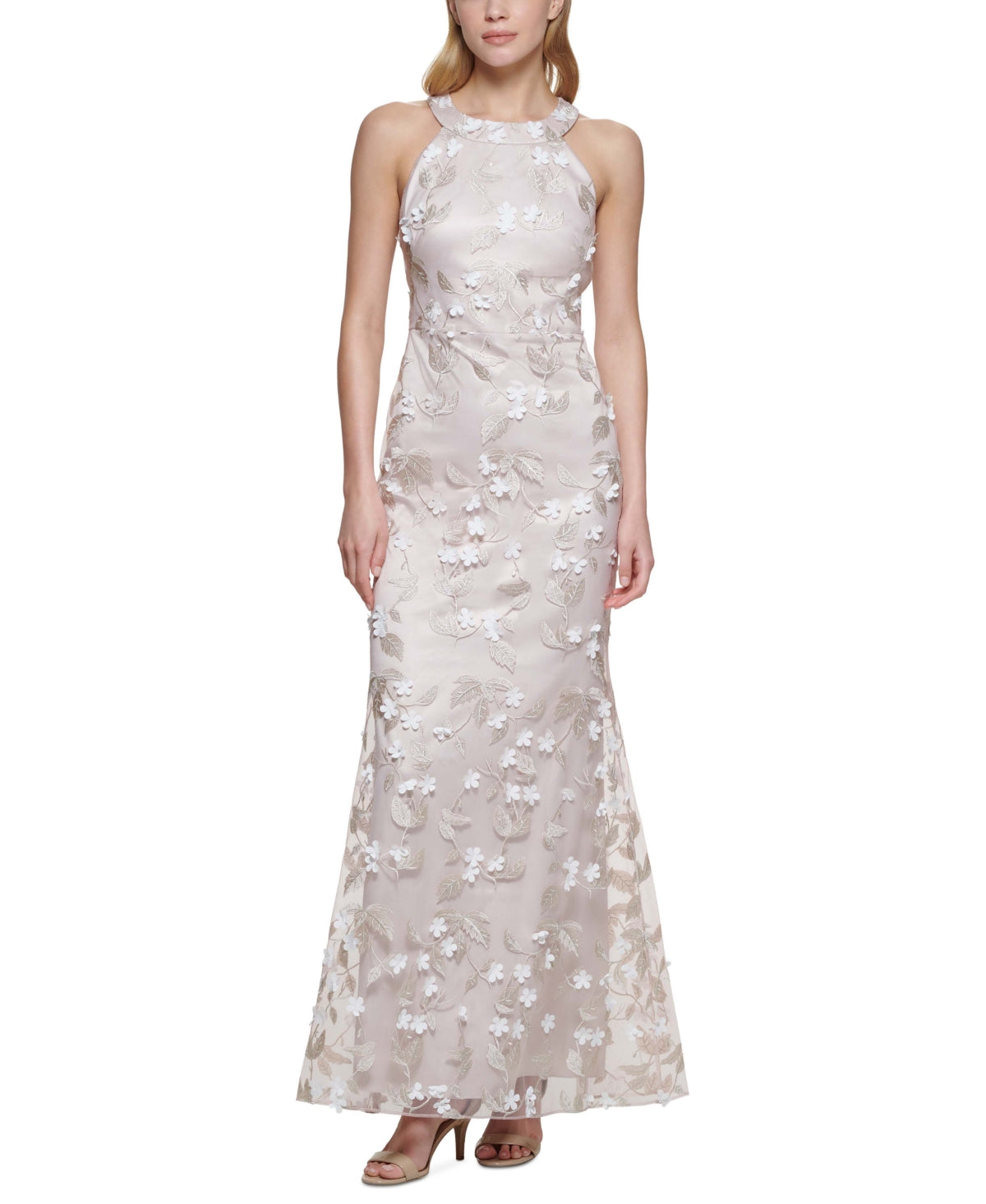 Cor bege/branca | Tamanho 2 | Design com apliques florais | Marca Eliza J | Comprado na Nordstrom | Estilo de vestido elegante | Mistura de materiais para conforto | Sem mangas | Corpete justo | Saia longa | Cintura marcada | Fechamento com zíper nas costas | Decote em V