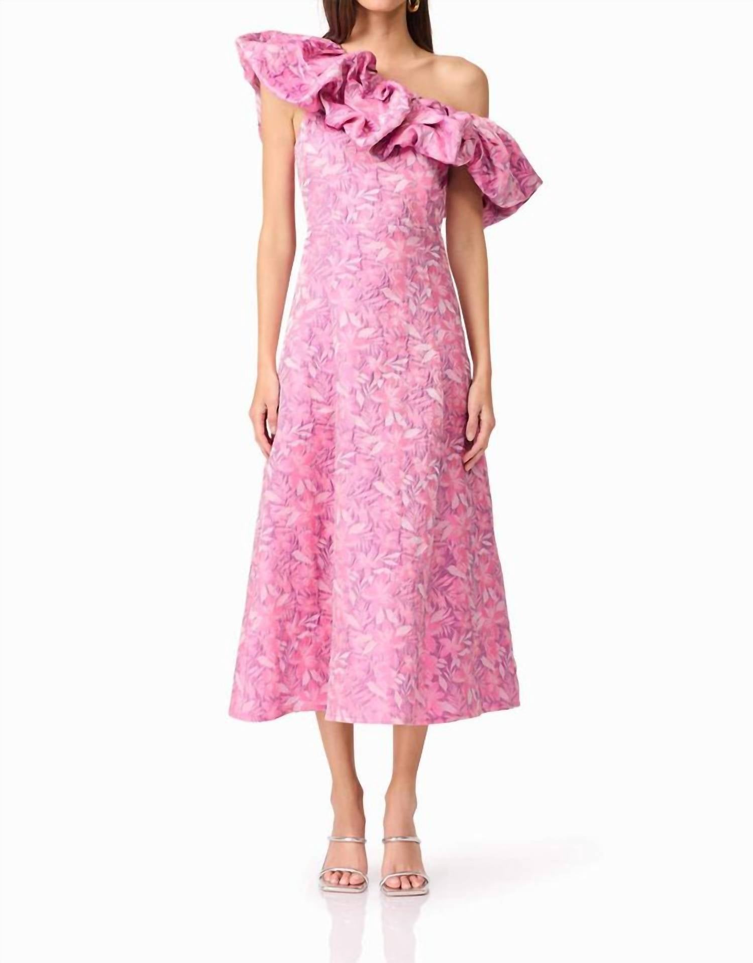 Presenting the Nadeen Midi Dress by ELLIATT, an elegant choice for any evening event. This sheath silhouette in a soft pink floral jacquard adds subtle texture with cap sleeves and off-the-shoulder neckline, capturing a maximalist trend perfect for spring. Made from high-quality polyester, it features a center-back invisible zip closure for a seamless fit. It’s designed without pockets and emphasizes sophistication for weddings or special gatherings.