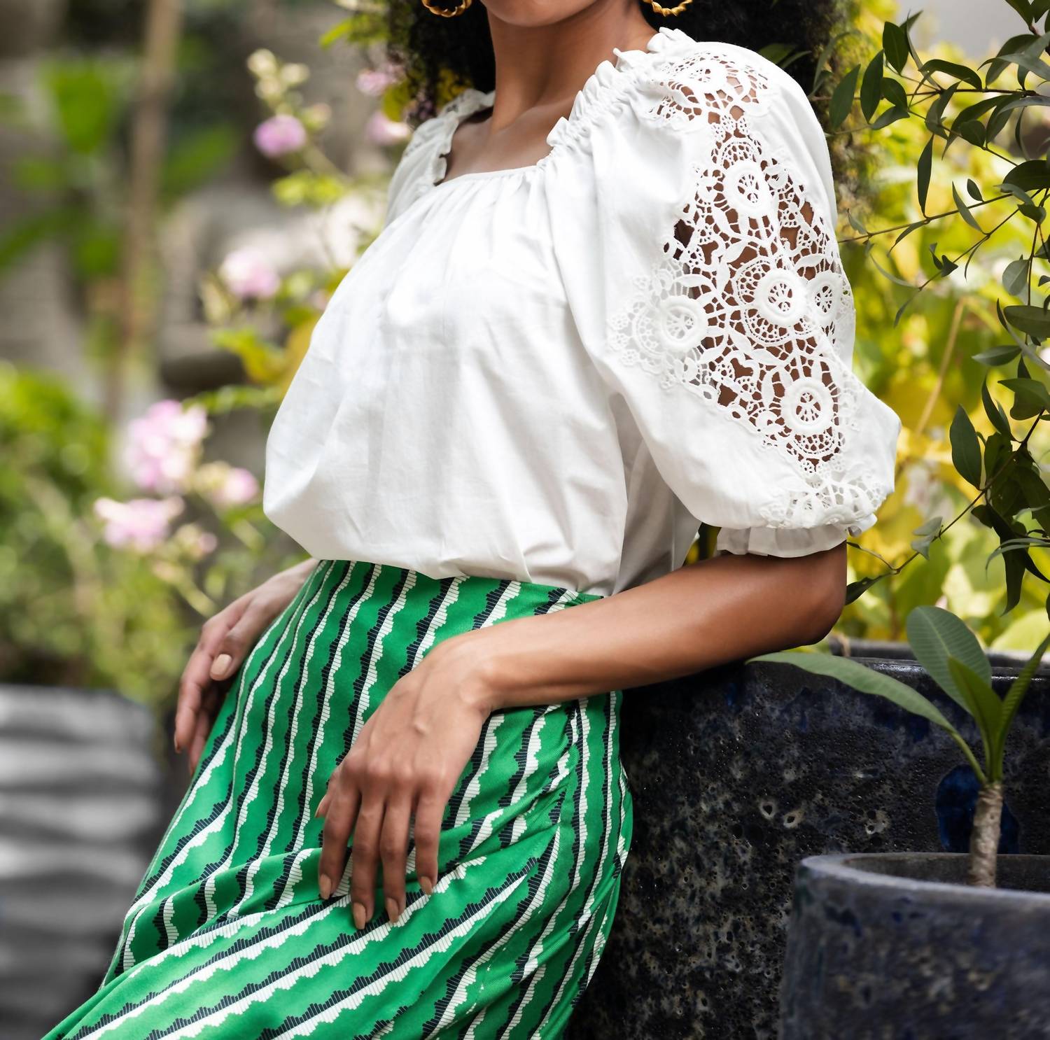 Uma blusa atemporal que nunca sai de moda. Apresentamos a Blusa Branca Rhea da EMILY LOVELOCK, uma peça chique perfeita para qualquer ocasião de primavera. Esta blusa estampada apresenta mangas curtas e um elegante decote quadrado, confeccionada em algodão de alta qualidade para conforto e durabilidade. Possui um prático fecho pull-on, aumentando sua versatilidade para o dia a dia.