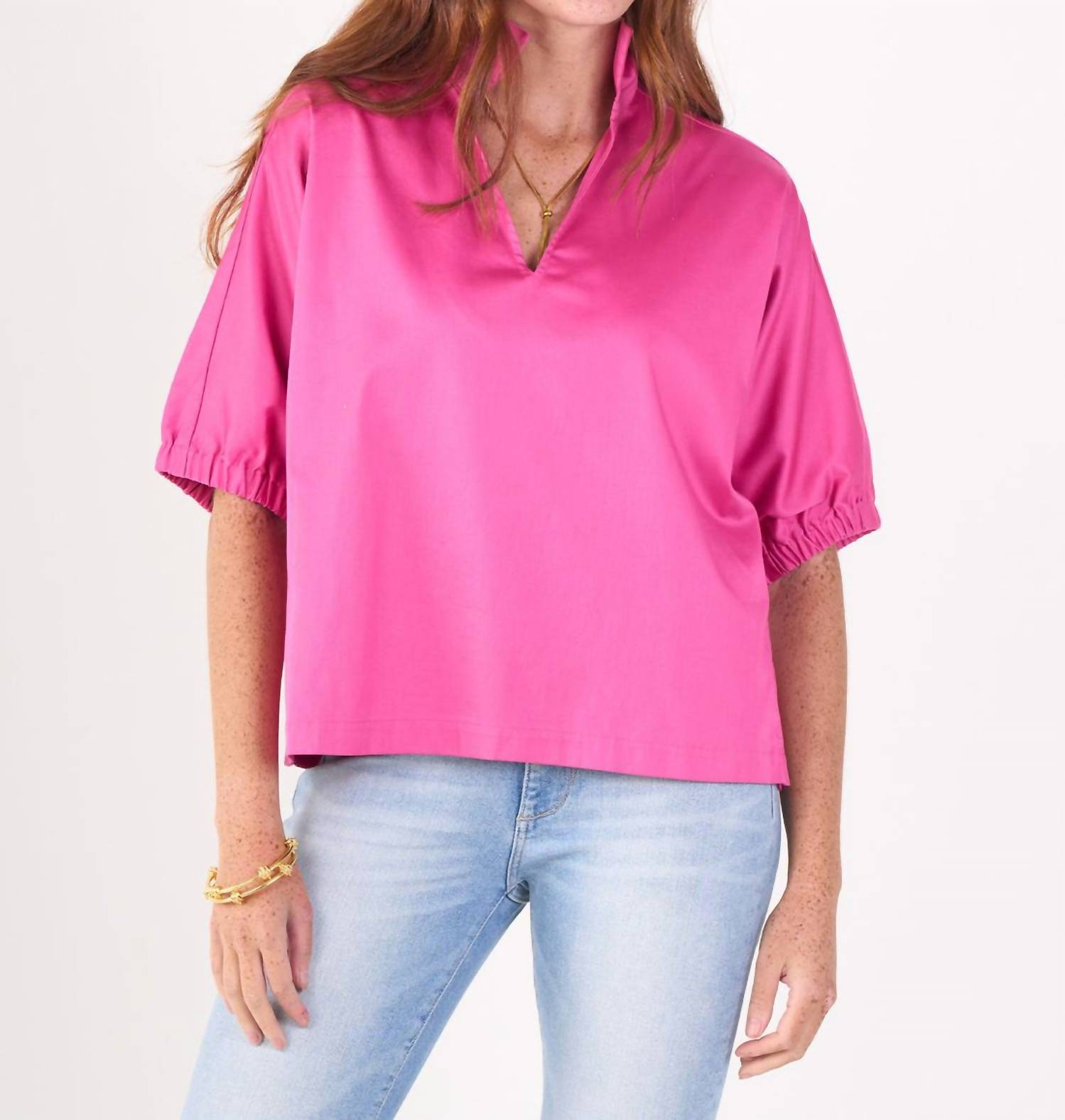 The Poppy Top by Emily McCarthy, in a vibrant Fuchsia Fedora, offers minimalist elegance for your holiday party wardrobe. This cotton poplin blouse features short sleeves and a classic collar, perfect for Thanksgiving and other spring occasions. It's designed with a convenient pull-on closure for easy wear. Care instructions: Hand wash and line dry.