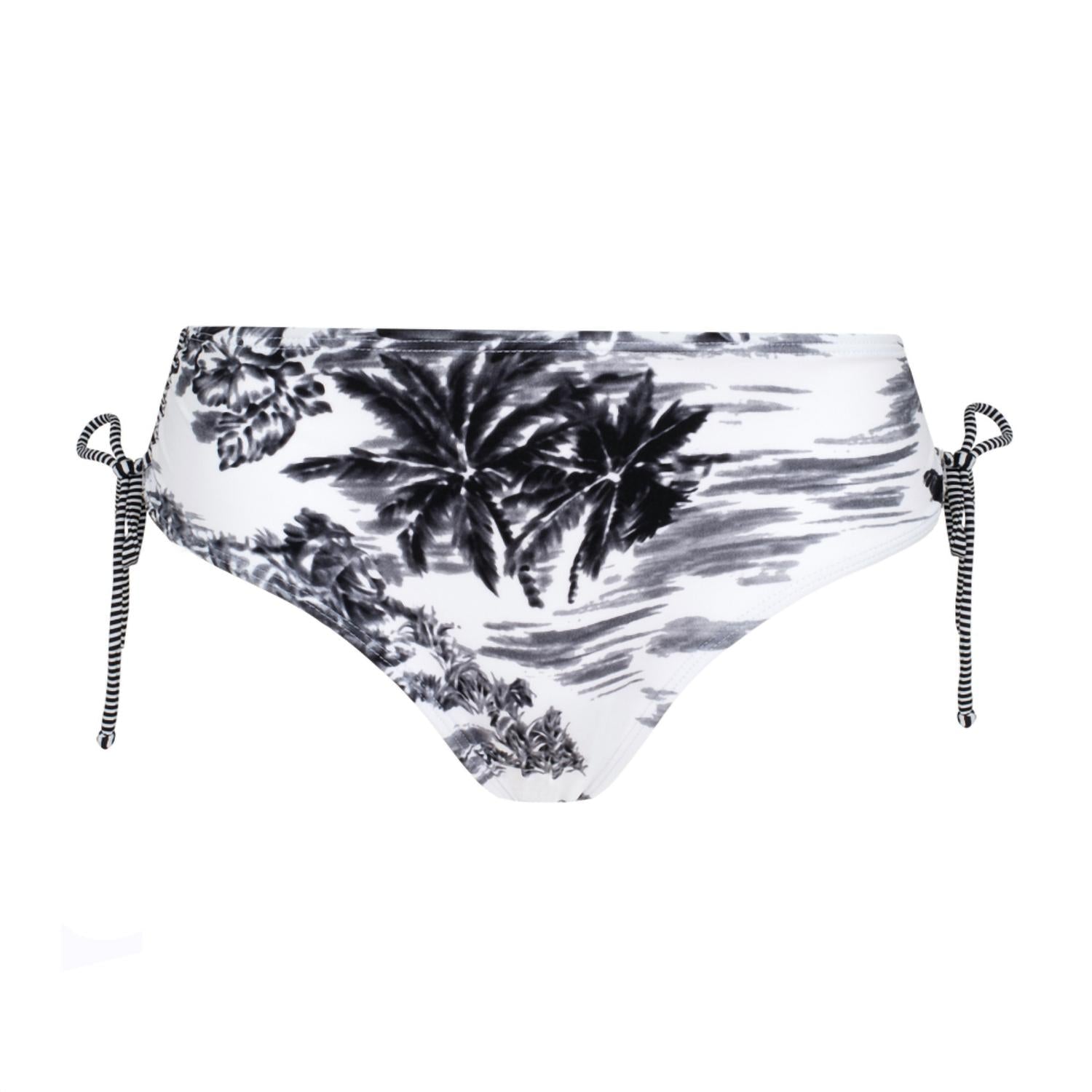 This cute and flattering swimsuit is perfect for making a splash at the pool, lounging on sun-kissed beaches, and staying stylish throughout the upcoming summer season. Experience timeless elegance and tropical charm with the Empreinte High Waist Adjustable Bikini Bottom in the Story colorway. These graphic print bikini bottoms are composed of 81% Polyamide and 19% Elasthane, offering full coverage with a high rise for added comfort and a smoothing effect. Although designed with no country of origin specified, they feature playful striped ties and a vintage black-and-white Hawaiian print, perfect for a chic beach day. Care: Hand wash and line dry to maintain the vibrant summer look.