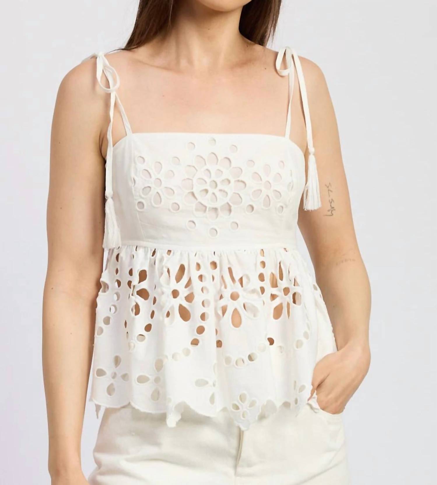 Perfeito para usar em camadas ou bonito o suficiente para ser usado sozinho. Descubra o Top Courtney da En Saison, uma peça marcante perfeita para o seu próximo jantar ou festa de 4 de julho. Este top peplum babydoll sem mangas apresenta um fecho de amarração divertido no ombro, complementado por bordados requintados e um decote quadrado. Feito em 100% algodão, o tecido texturizado adiciona um toque de charme maximalista. Feito para a primavera, este top importado deve ser lavado à mão para manter sua condição impecável.