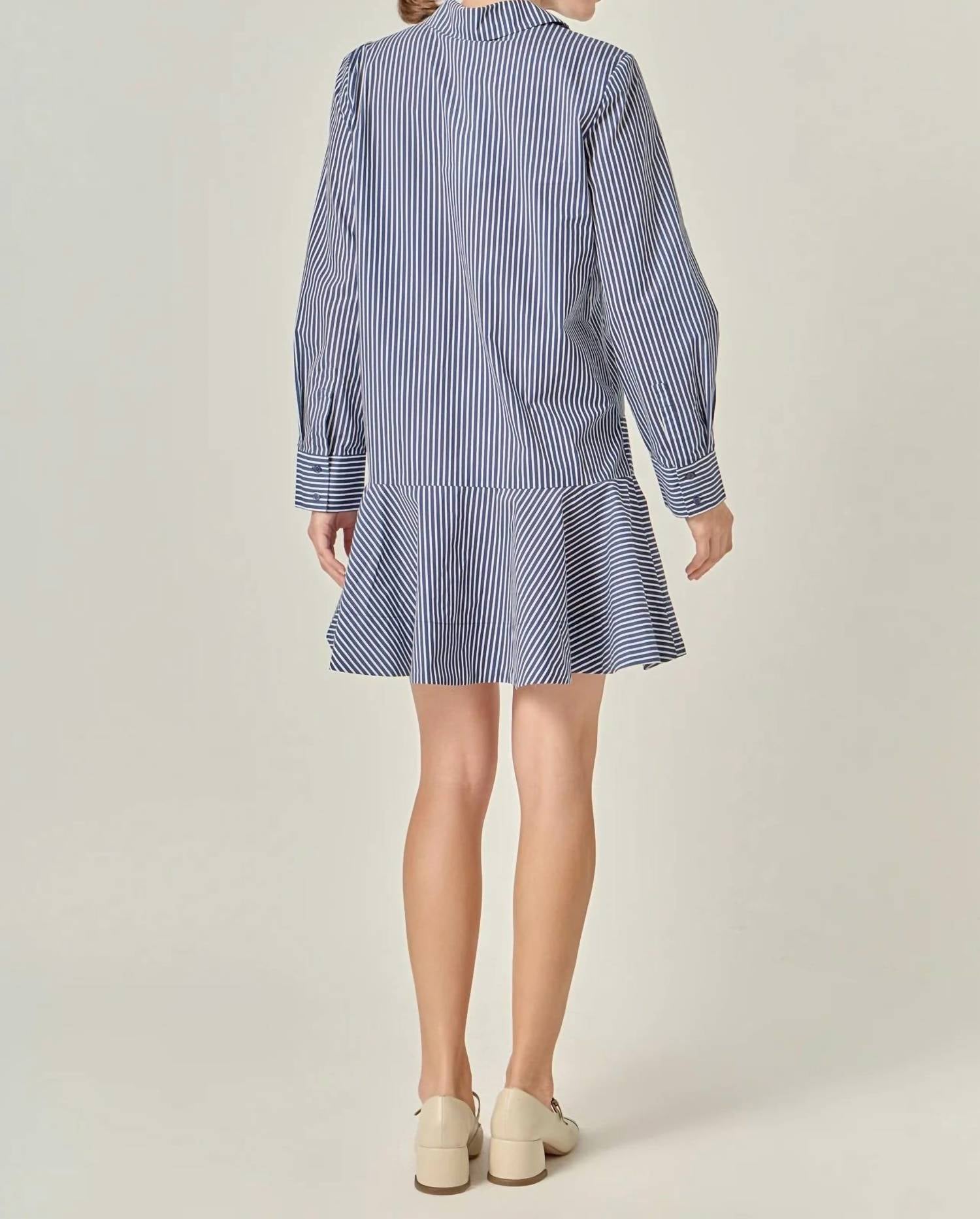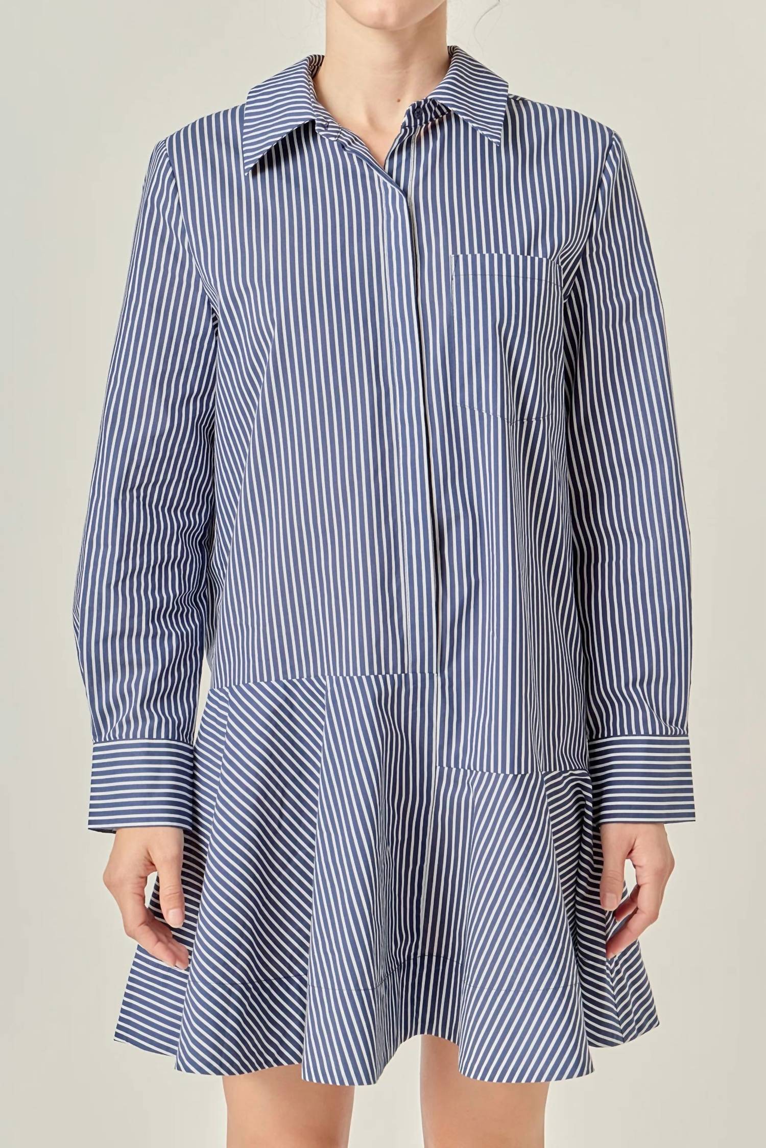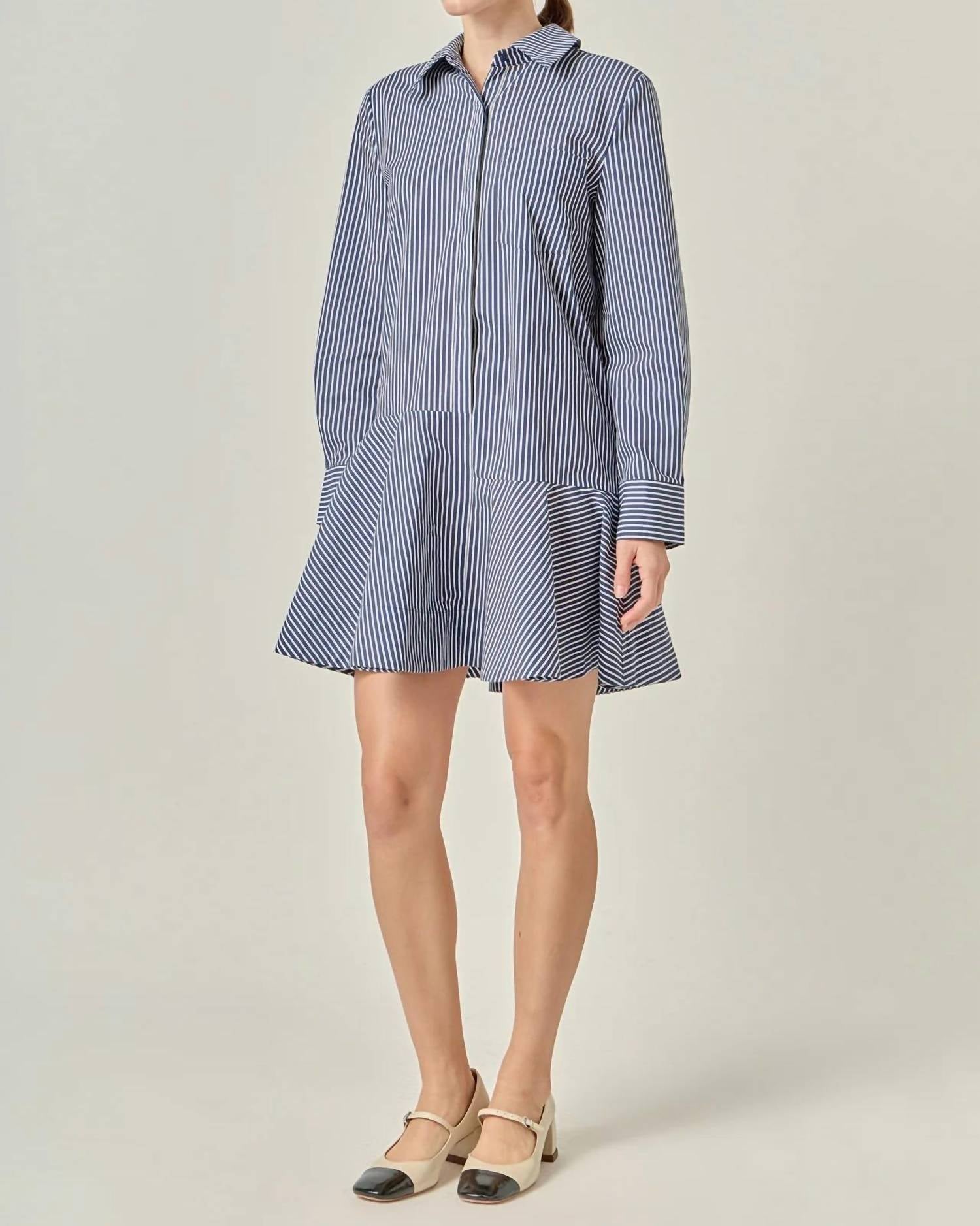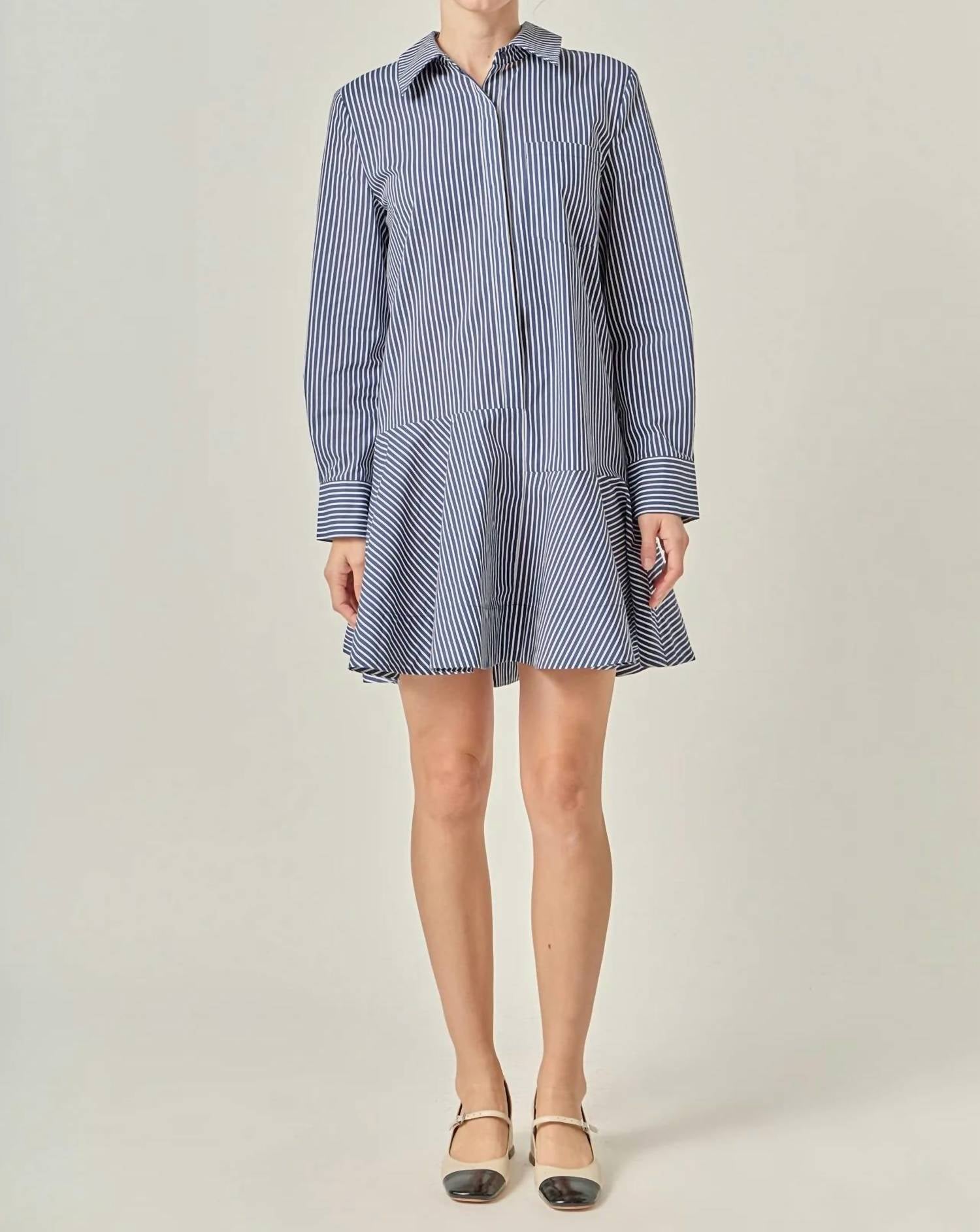 The kind of easy and flattering dress you'll be reaching for all season long. Elevate your wardrobe with the Stripe Collar Flared Skirt Dress by English Factory, a chic homage to 90s fashion in navy. This mini-length dress is crafted from a cotton blend (85% Cotton, 15% Nylon) and features long sleeves with buttoned cuffs, a crisp collar, and a single-breasted pocket on the chest. Its design benefits from a hidden front placket button closure, creating a polished silhouette that flatters with a cascading flared skirt. Ideal for summer vacations, this dress combines tailored sophistication with playful movement. Care: Hand wash.
