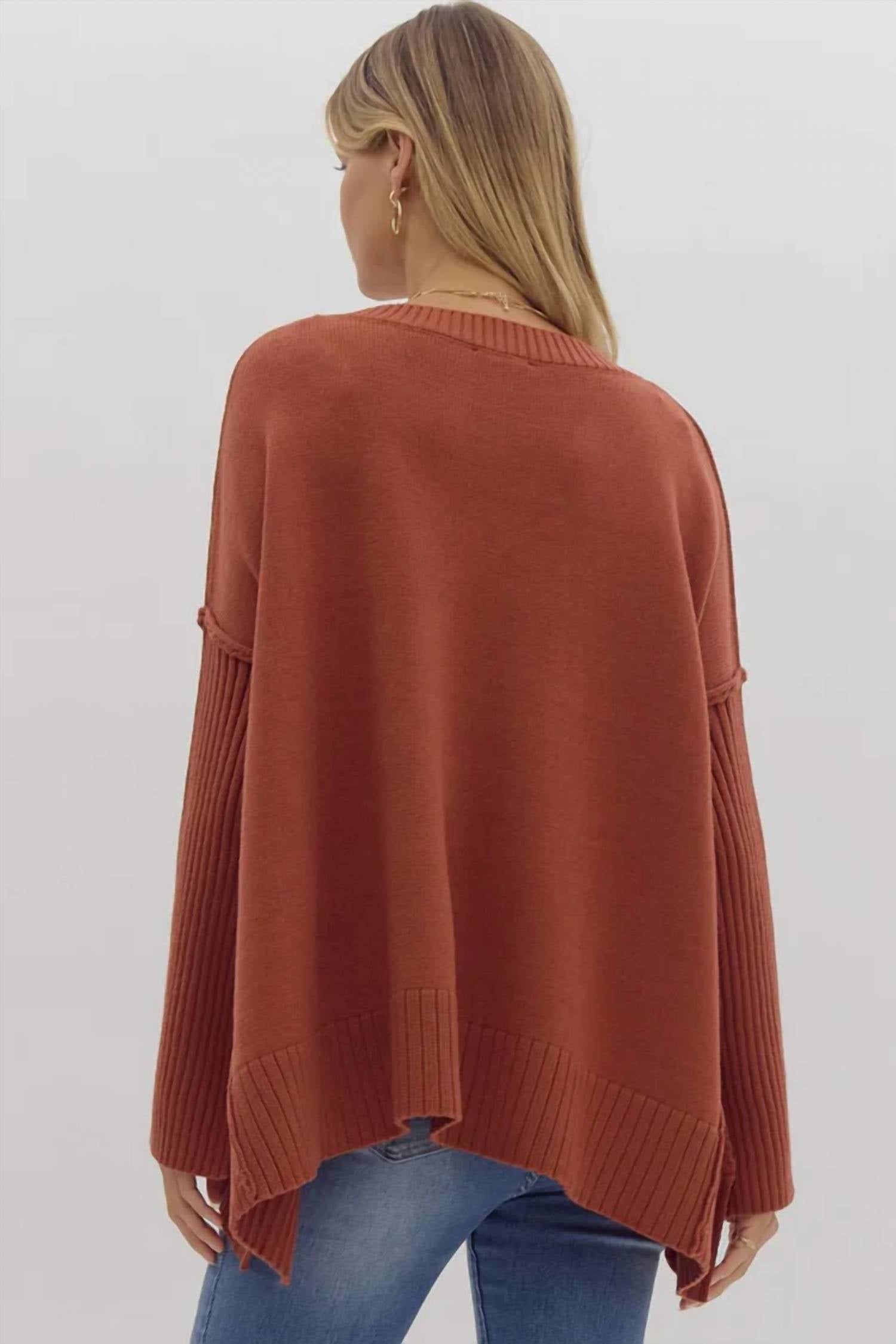 Embrace the effortless style in a warm ginger hue. Designed with long sleeves and crafted from soft viscose. Ensures comfort and versatility for any casual occasion. Featuring a flattering V-neckline. Easy to slip on with its convenient pull-on closure. Solid, timeless piece made with care for your everyday wear.