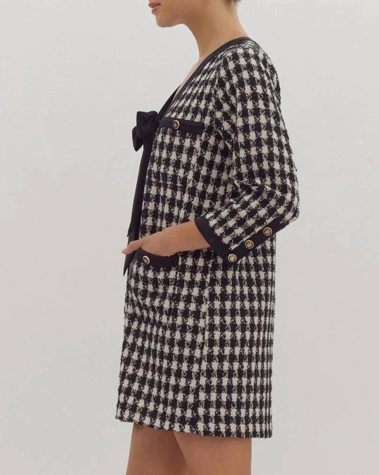 The Audrey V-neck Button Up Dress by Entro is a chic mini dress crafted for women in a playful plaid and check pattern. Featuring three-quarter sleeves and made from lightweight polyester, it's perfect for any occasion, whether it's a holiday party or a casual summer workwear look. With convenient pockets and a button closure, this dress ensures both style and functionality with its elegant kaftan silhouette. For care, machine wash and line dry are recommended. It is made of 90% Polyester, 10% Wool.