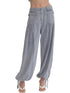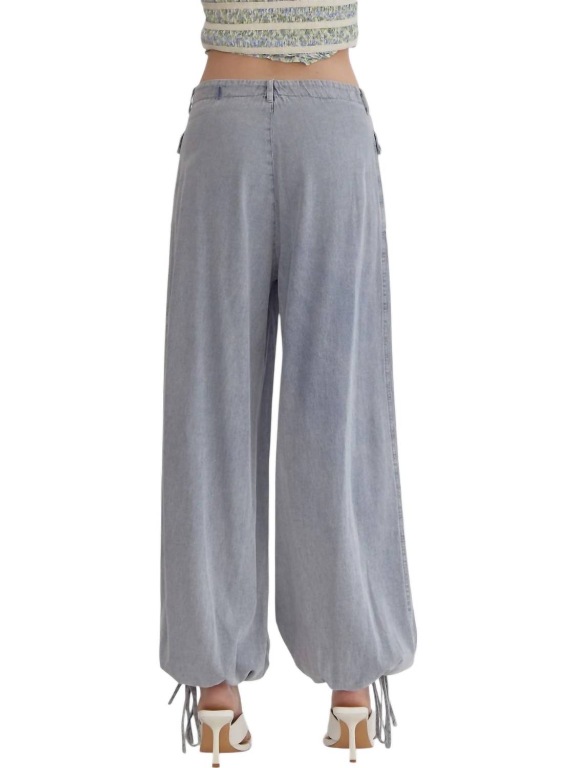 Perfect fusion of comfort and style with a balloon silhouette. Solid, light blue pants. Feature a cinch-tie at the ankles, offering a customizable fit. Designed with functional front pockets and convenient belt loops. Finished with a front button and zipper closure.