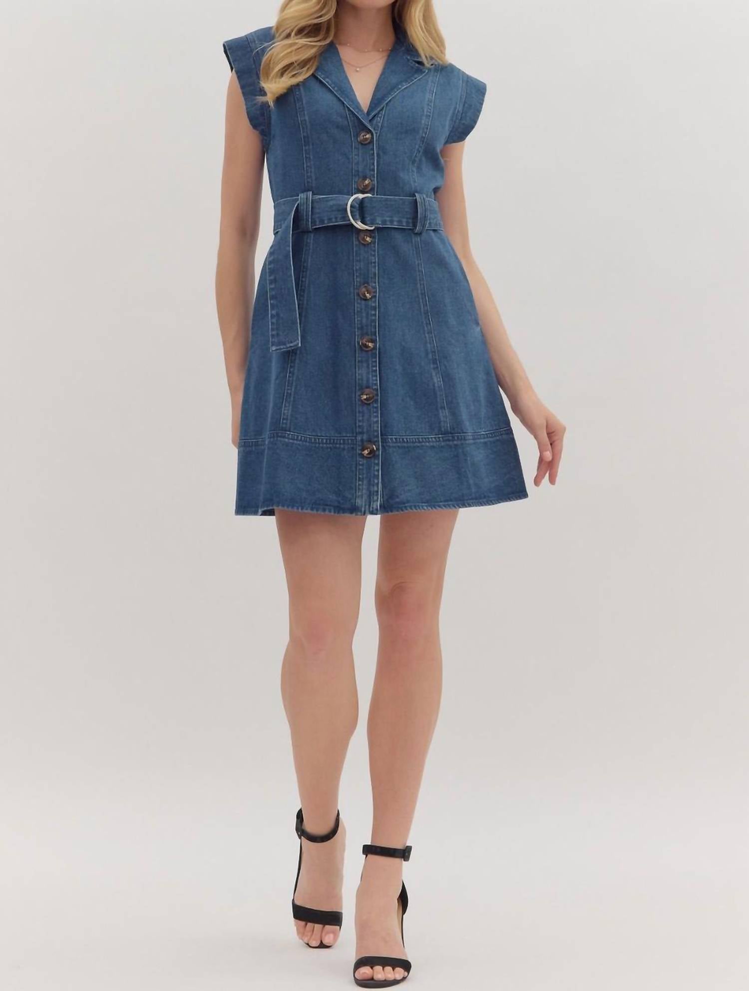 The kind of easy and flattering dress you'll be reaching for all season long. The Entro Cap Sleeve Belted Denim Mini Dress is a chic and smart choice for a minimalist summer look. Made from 100% cotton, this solid piece features cap sleeves and a flattering A-line silhouette, perfect for vacation wear. It's equipped with a notched collar and side pockets, and the D-ring self-belt provides a flattering fit. Closure: Button closure. Care: Machine wash and tumble dry.