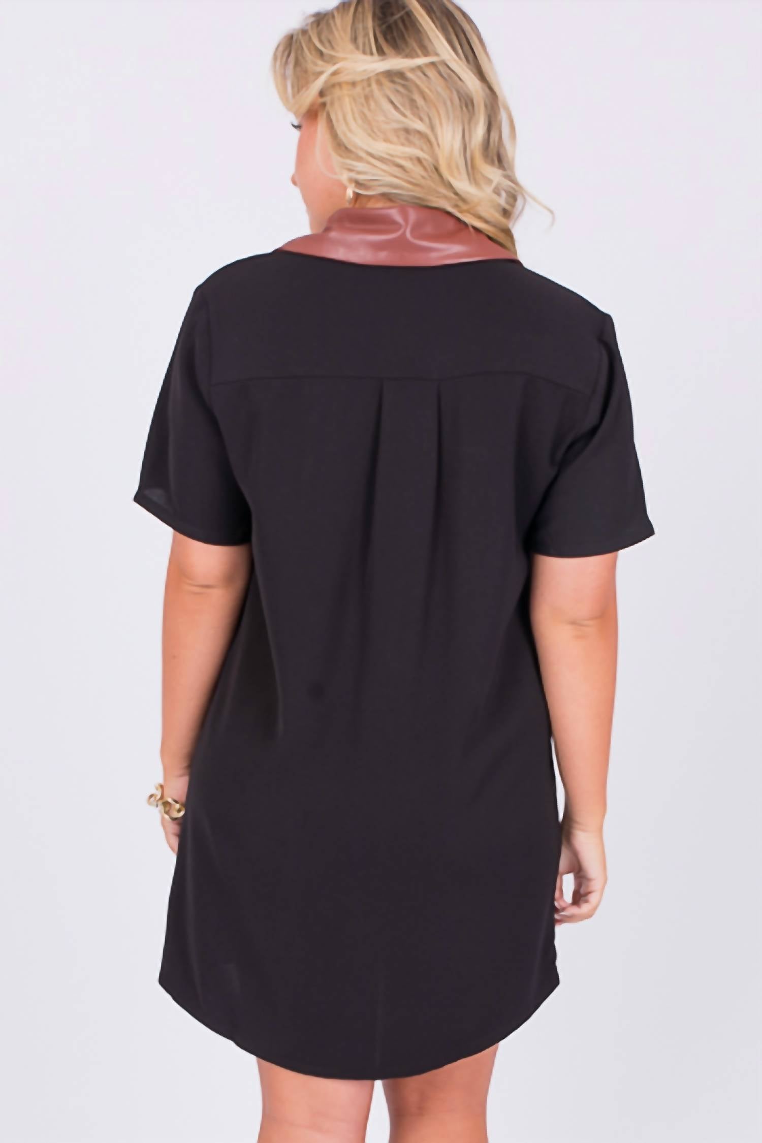 A short and breezy dress for those warmer days. Introducing the Entro Colorblock Collared Button Up Mini Dress, a chic choice for any evening event. This black shirt dress features short sleeves and a stylish faux leather contrast on the collar, chest pocket, and button placket. Made with 95% polyester and 5% spandex, the dress is designed to hit at a mini length of 33 inches. Closure: Button closure. For best results, hand wash and line dry.