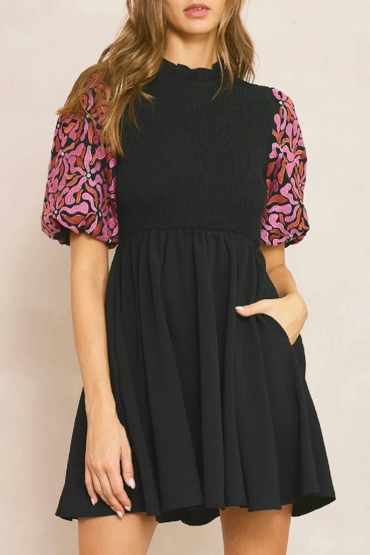 The kind of easy and flattering dress you'll be reaching for all season long. Introducing the Embroidered Puff Sleeve Dress by Entro, an exquisite piece perfect for your summer wardrobe. This black mini dress comes with short bubble sleeves featuring dainty ruffles and embroidery, and a flattering smocked body. Crafted from 98% polyester and 2% spandex, it features handy side pockets and a sleek button closure at the back neckline. For care, simply hand wash to maintain its boho chic charm.