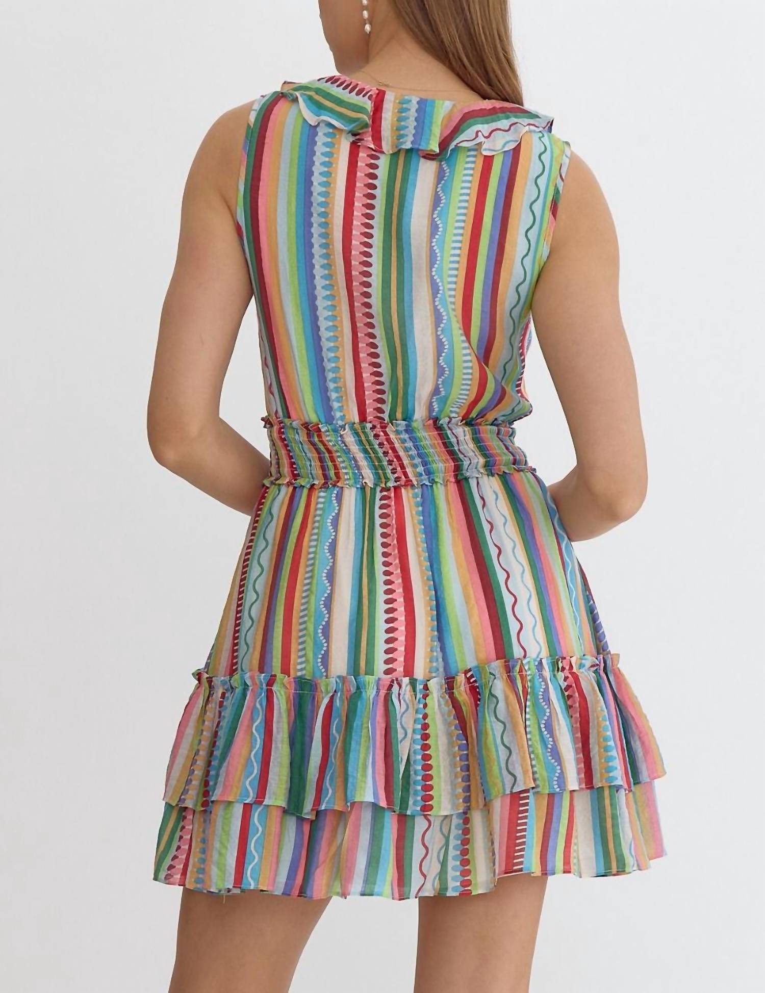 O minivestido perfeito para os meses mais quentes. Este minivestido sem mangas apresenta uma estampa listrada em azul, vermelho, laranja e verde. Possui decote em V com babados, bolsos laterais, cintura franzida e saia com babados em camadas. O vestido é forrado, tecido, não transparente e leve, feito de 75% rayon e 25% náilon. Tamanho real. A modelo tem 1,78 m e veste tamanho P.