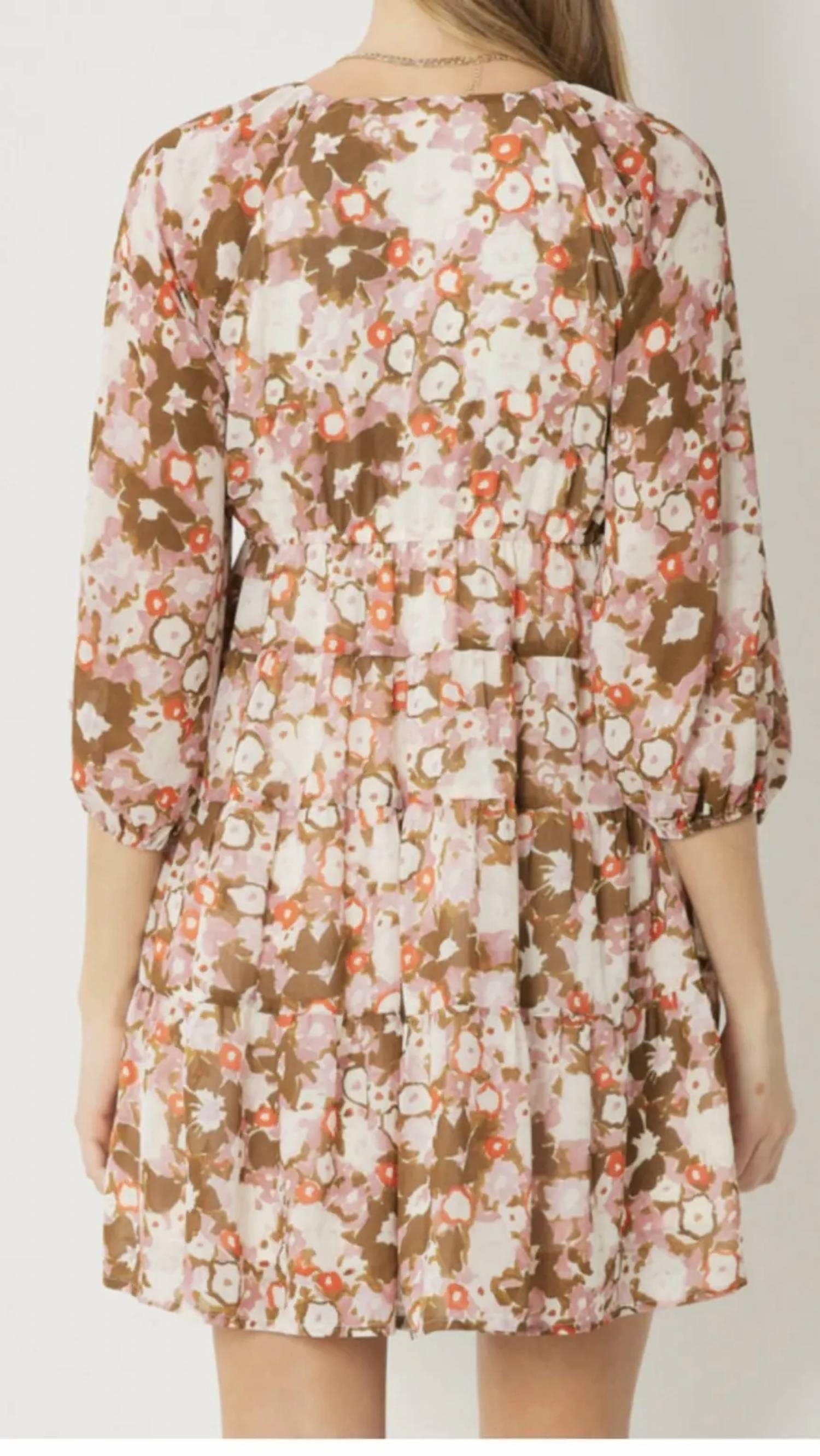 Introducing the Floral Print V-neck Dress by Entro, a perfect choice for a summer vacation with its boho chic appeal. This mini dress features charming three-quarter sleeves with elastic openings and an empire waist silhouette. The dress is crafted in a delightful mauve mocha floral print and is lined for comfort, making it a stylish and practical choice. Closure: Side zipper. Care: Hand wash, line dry.