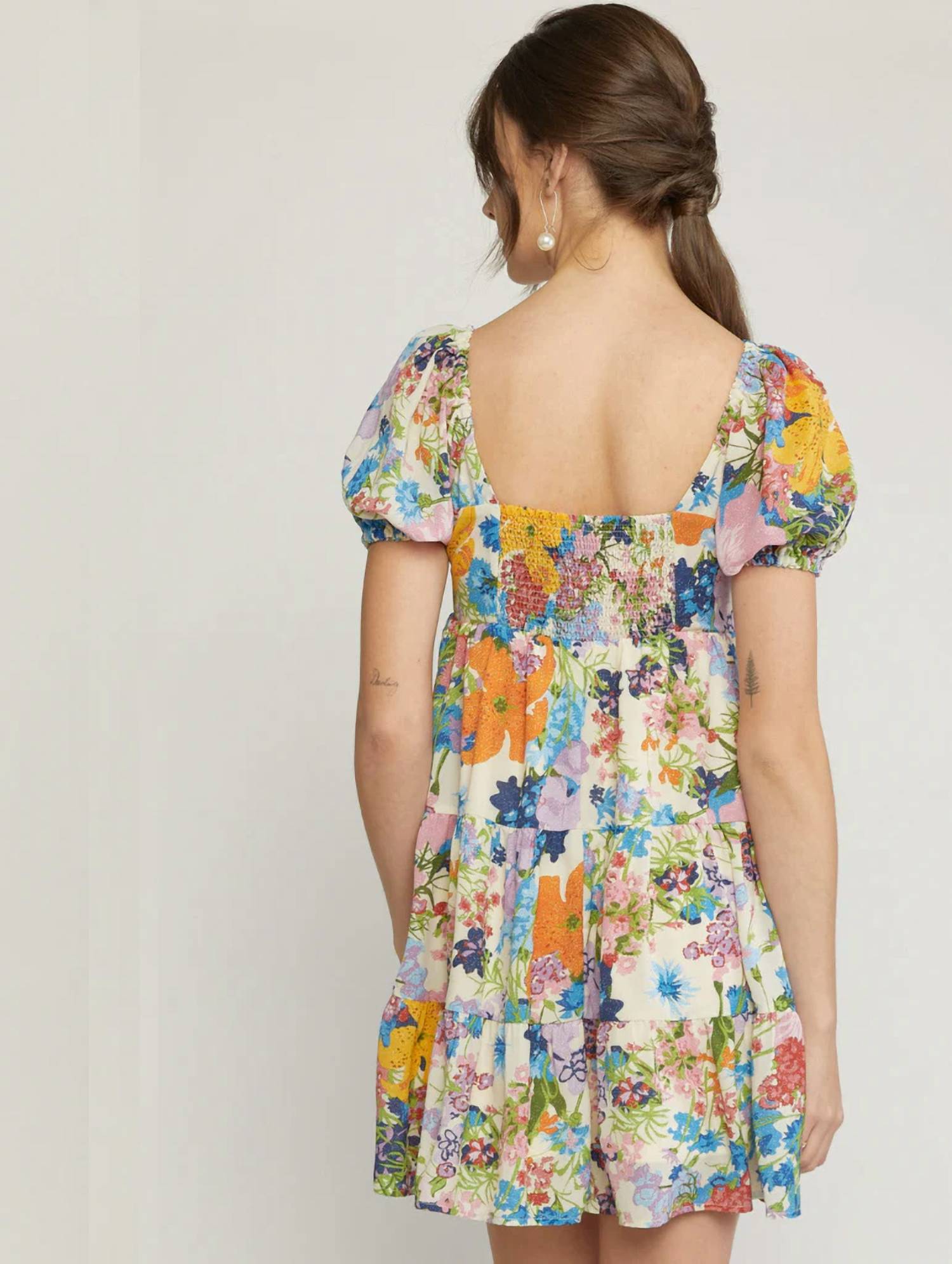 Embrace boho chic style with the Floral Print V-neck Puff Sleeve Babydoll Dress by Entro, perfect for any summer vacation. Designed for women, this cream mini dress features short puff sleeves and an empire waist silhouette, offering a playful yet elegant look. Made from lightweight 100% polyester material with a woven, non-sheer lining, it includes an elastic shoulder and cuff for a snug fit and a side zipper closure for ease of wear. Complete your ensemble with this trendy v-neck dress, seamlessly blending floral patterns with functionality.