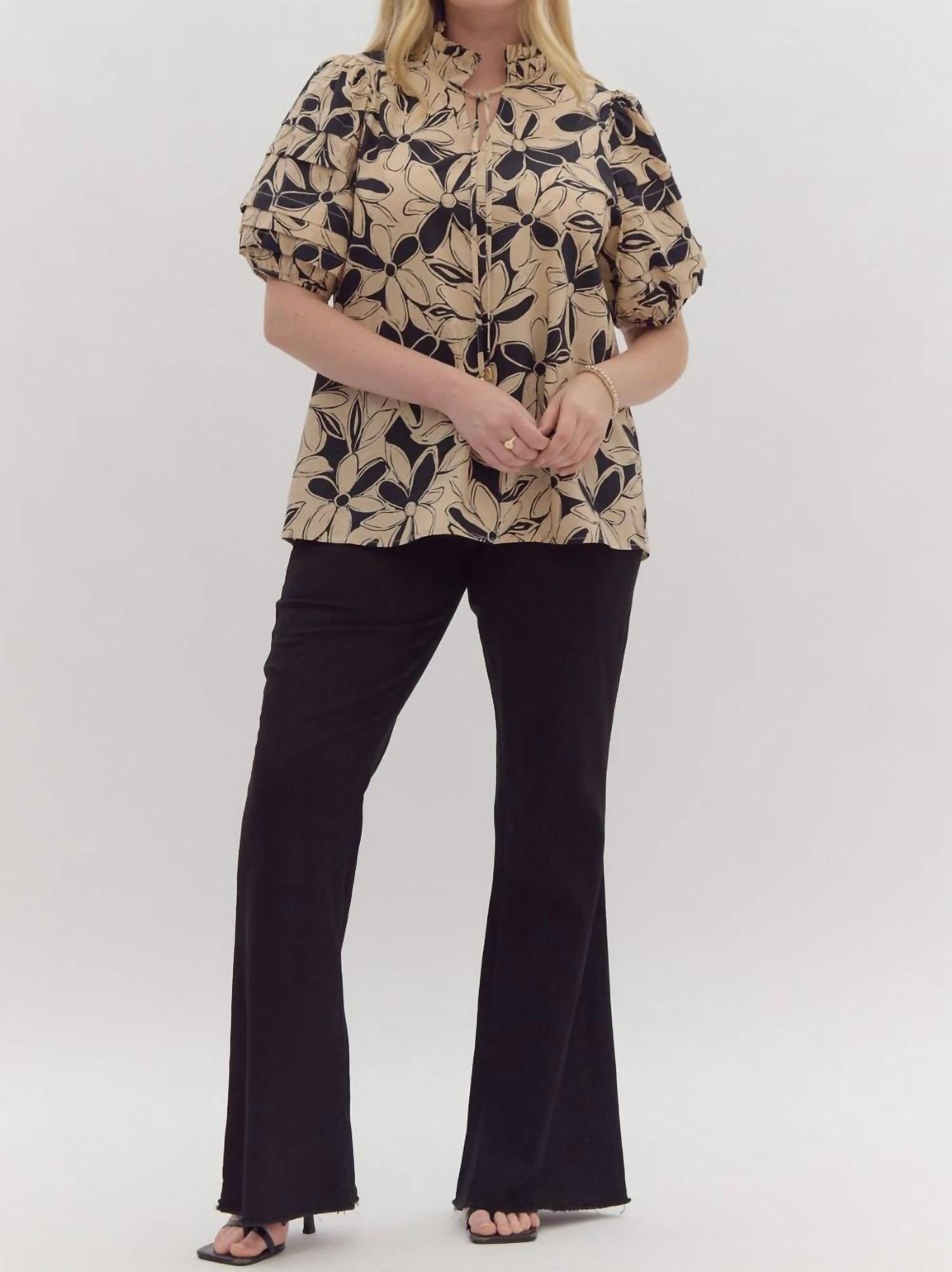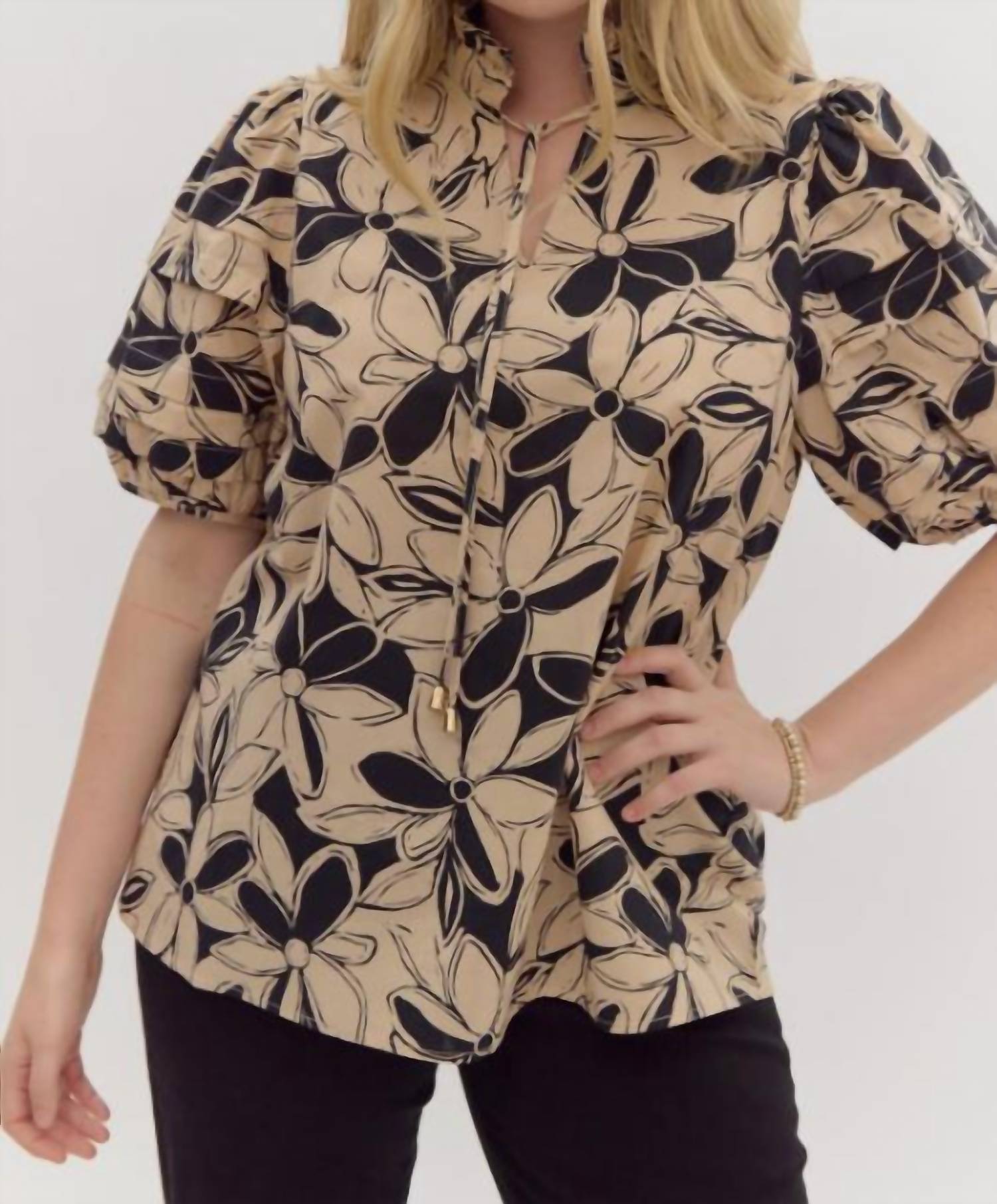Uma blusa atemporal que nunca sai de moda. Esta blusa de manga curta com decote em V apresenta uma charmosa estampa floral, detalhe de amarração no decote e mangas em camadas. Não tem forro e é feita de 100% algodão.