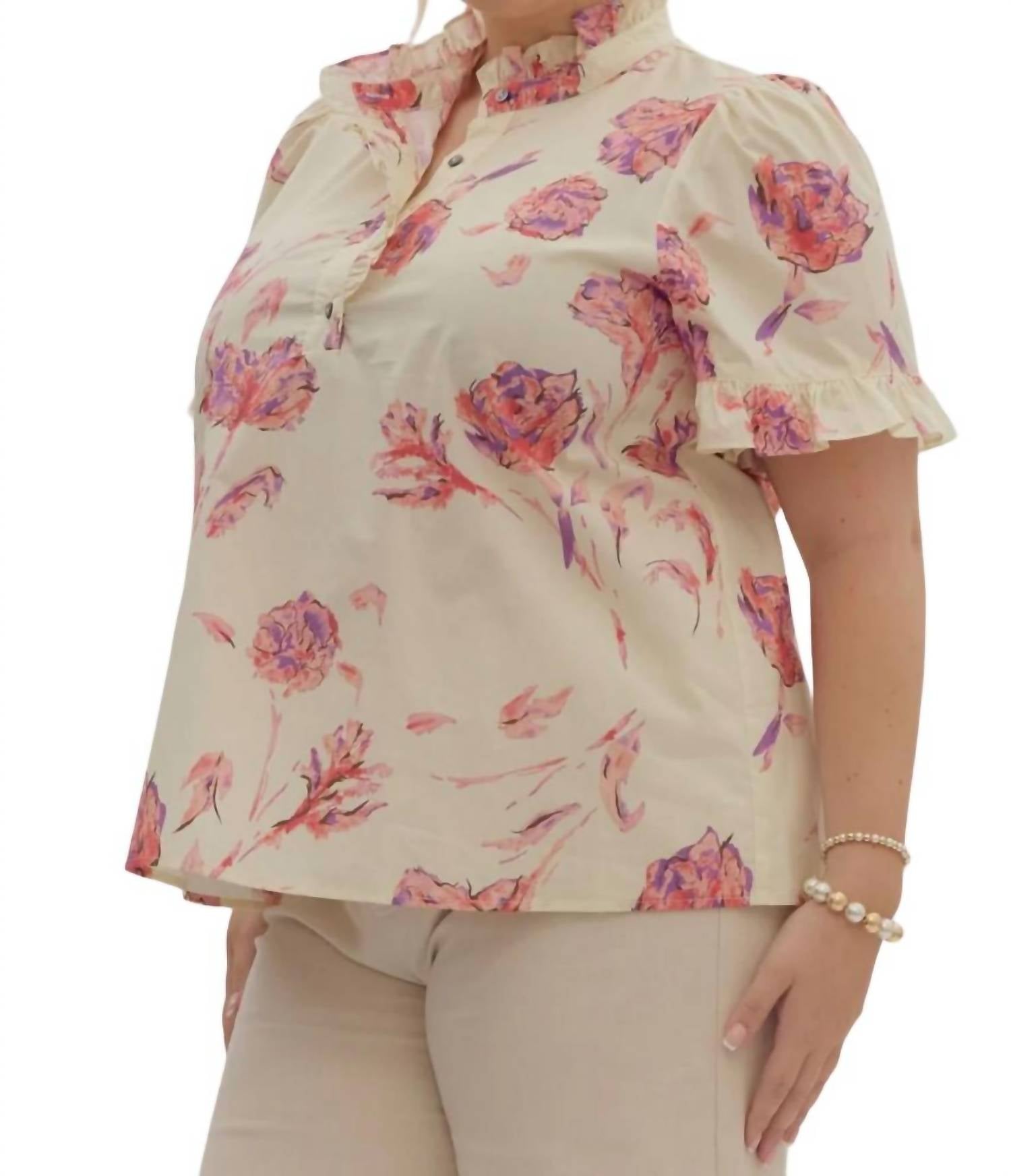 Combine com seus jeans e chinelos favoritos para sua próxima noite entre amigas. Este top floral apresenta gola alta com delicado acabamento em babados e botões frontais adornados com babados laterais. Possui mangas curtas bufantes com punhos soltos e babados, além de não ter forro. Feito de 100% algodão, recomenda-se lavar à mão com água fria.