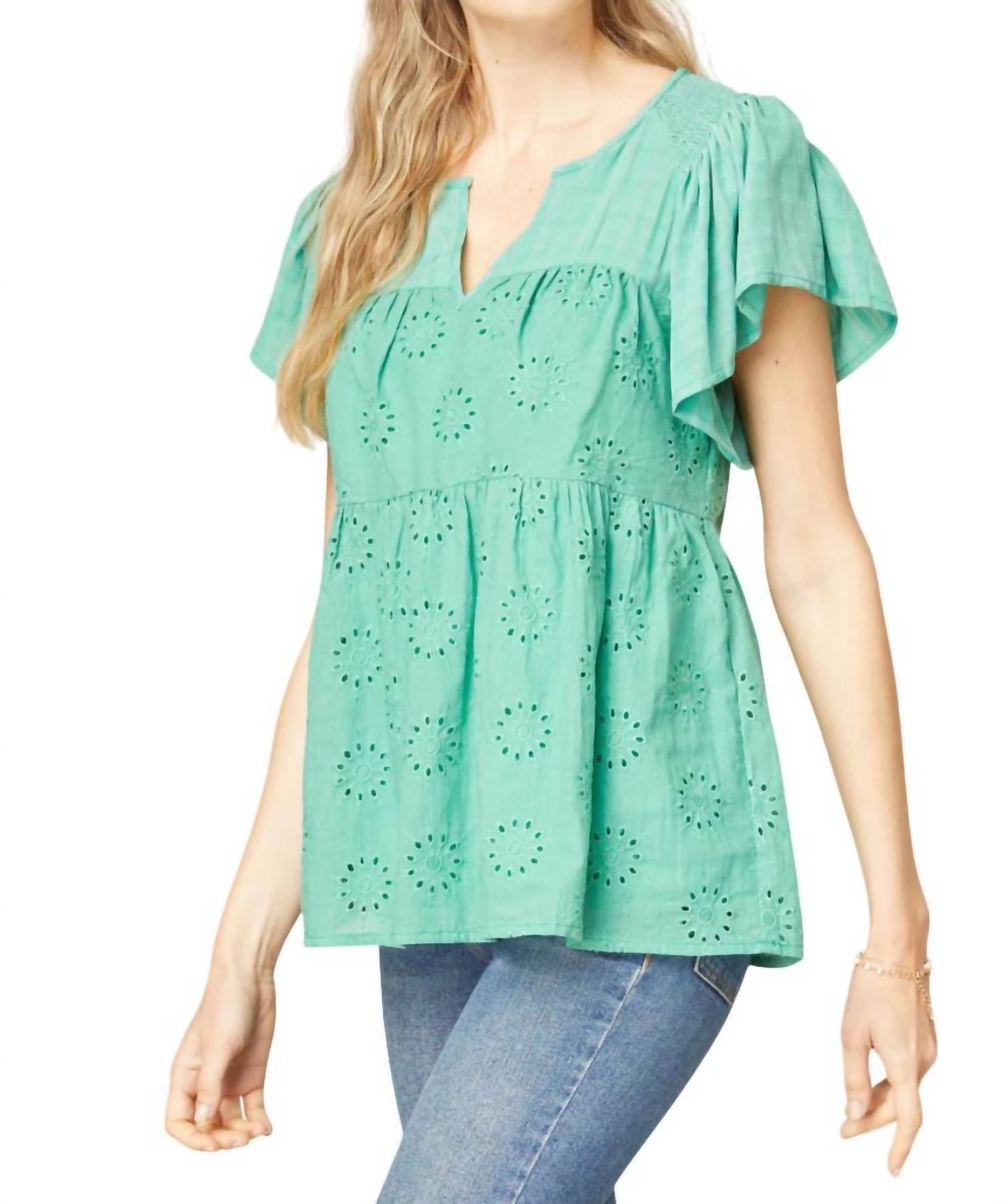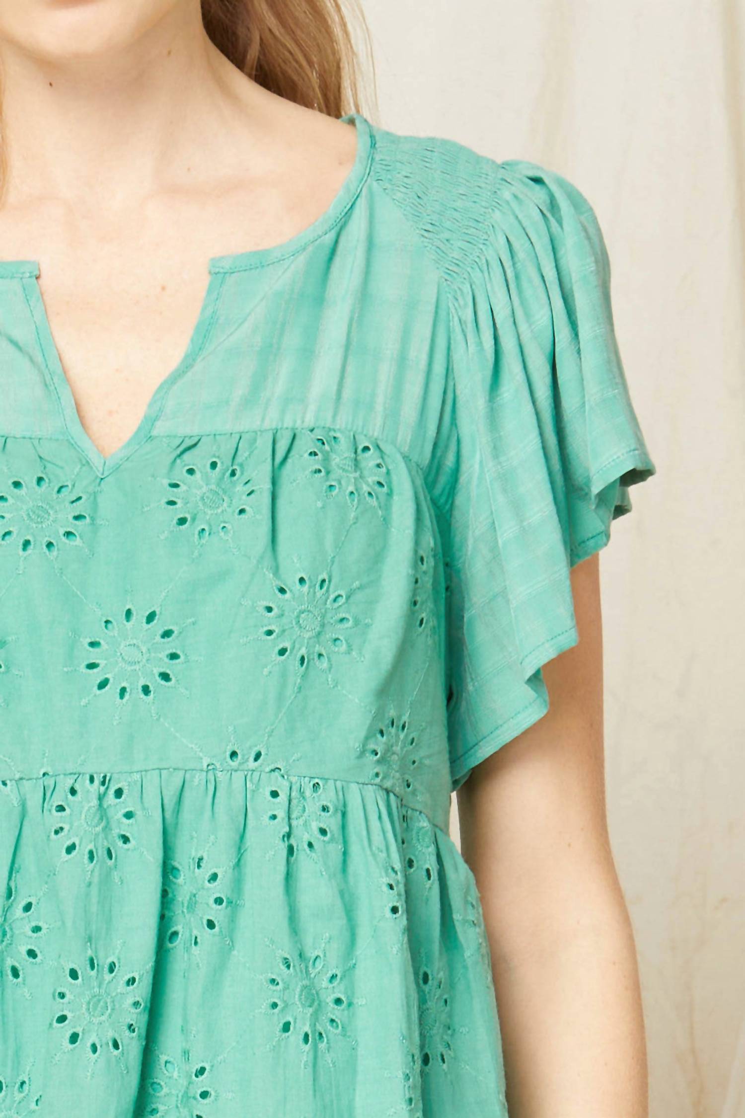 Uma blusa atemporal que nunca sai de moda. Apresentamos a Blusa com Mangas Flutter e Ilhós da Entro, uma adição charmosa ao seu guarda-roupa em um tom verde refrescante. Esta blusa apresenta mangas curtas fluff, decote em V com fenda e detalhes em ilhós, além de uma silhueta babydoll em corte A que valoriza o corpo. Confeccionada com sobreposição de ilhós em poliéster e algodão, é totalmente forrada com 100% poliéster. Fechamento: Puxe para vestir. Cuidados: Lavar à mão ou a seco. Tamanhos disponíveis: Pequeno (Busto 91 cm, Comprimento 63 cm), Médio (Busto 96 cm, Comprimento 63 cm) e Grande (Busto 102 cm, Comprimento 63 cm). O tecido não estica.