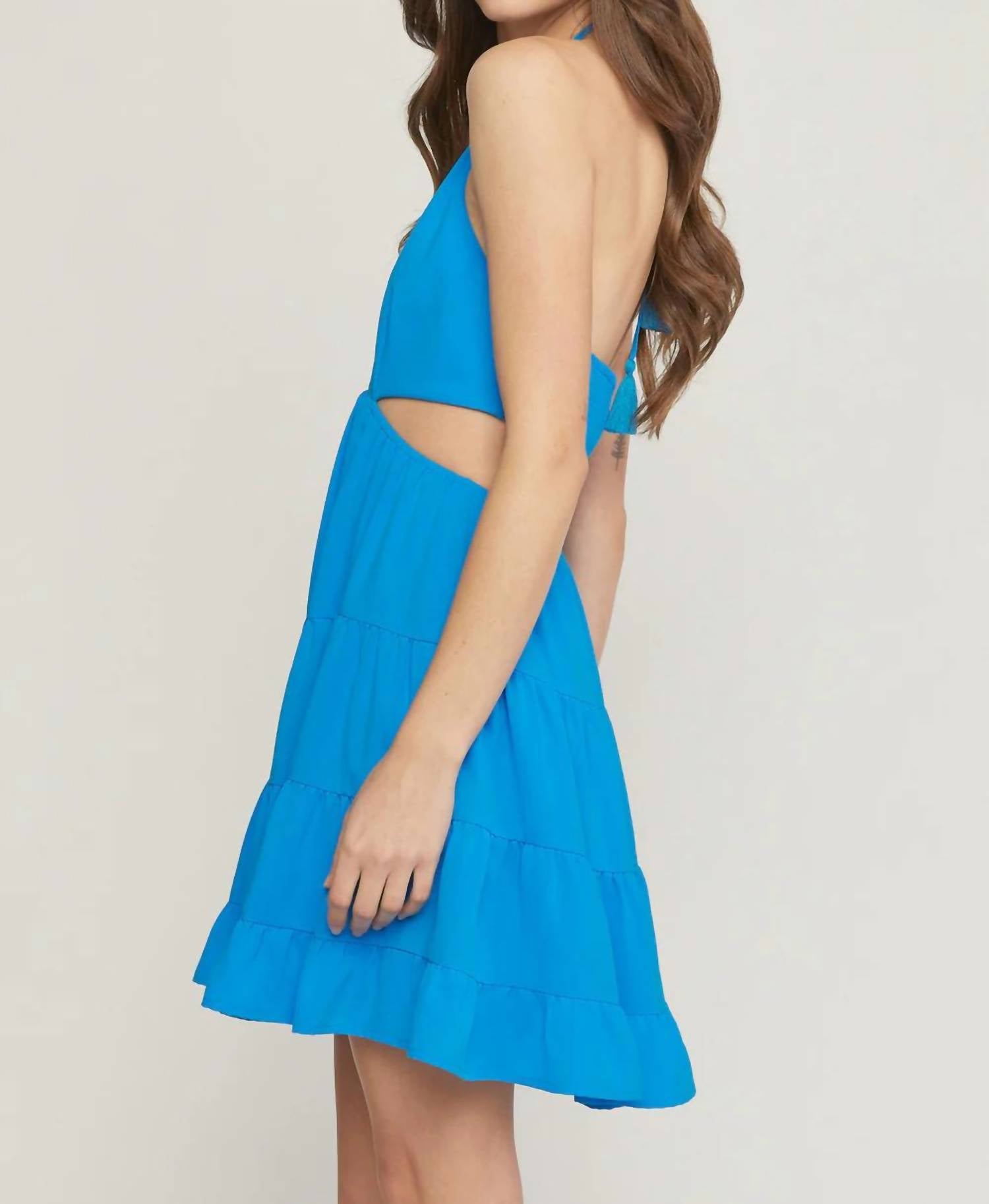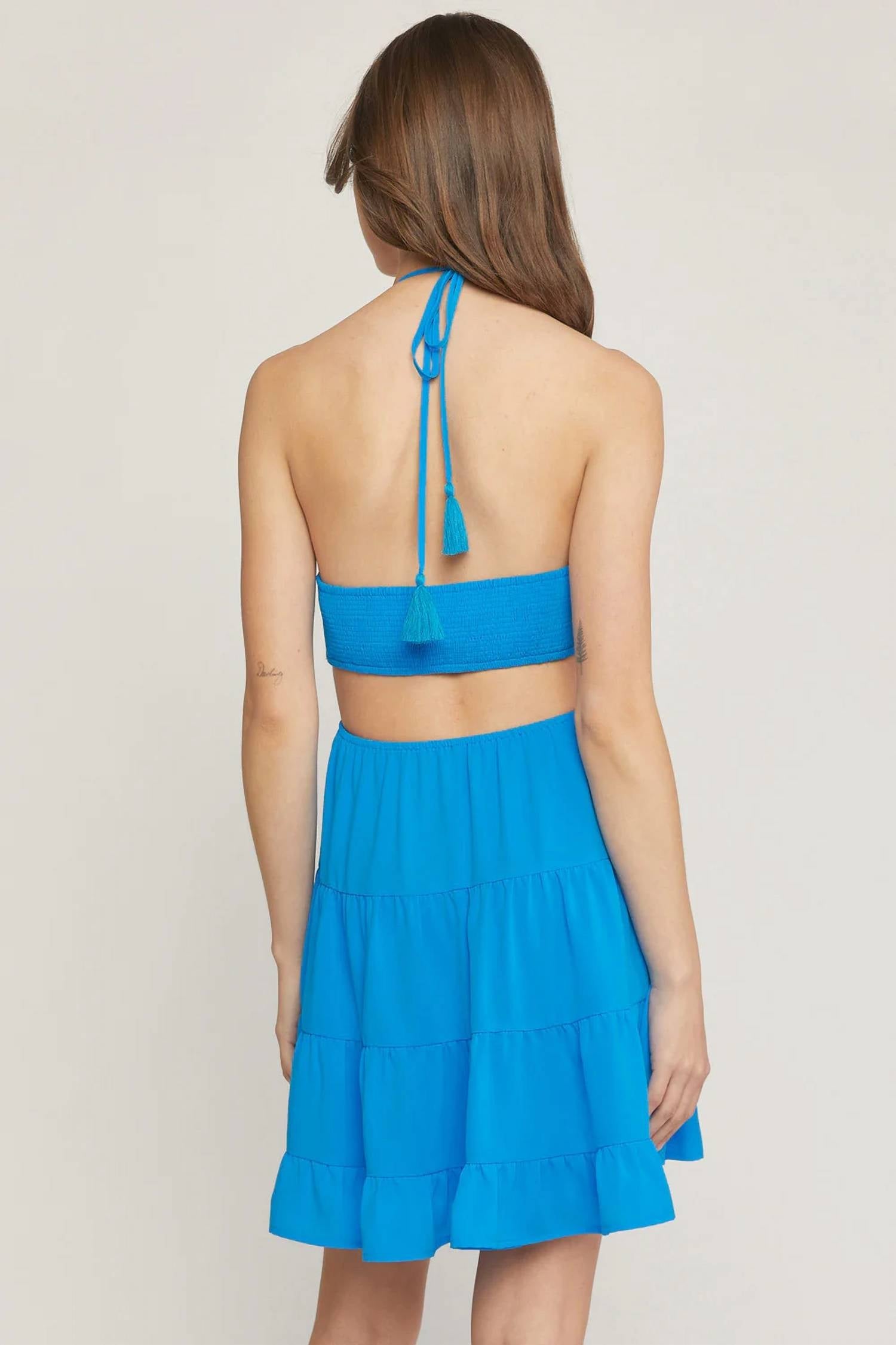 A short and breezy dress for those warmer days. Discover the Halter Dress With Cut Out by Entro, an elegant piece in a solid blue shade perfect for vacation vibes. This sleeveless mini dress features a V-neck halter top and captivating side and back cutouts, accentuating an empire waist silhouette. Crafted from soft stretch woven fabric, it includes a smocked back and a self-tie closure at the neck, while a tiered skater skirt adds playful movement. Designed for minimalist appeal, this lightweight, lined dress will keep you stylish all summer long.