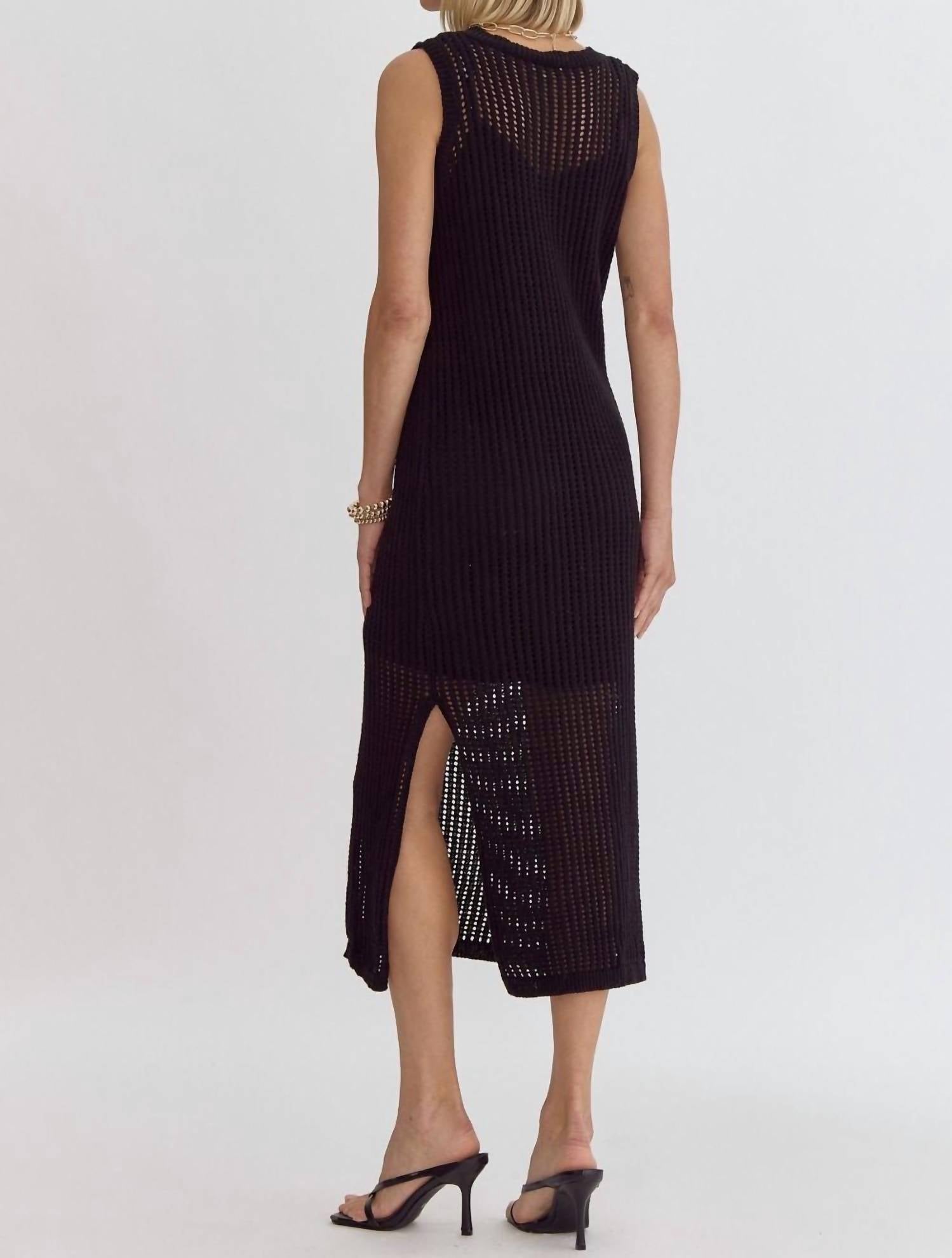 Experience effortless elegance with the Knit Sleeveless Midi Dress by Entro, designed in a chic cream hue. Crafted from 60% Cotton, 40% Acrylic, this semi-sheer A-line silhouette features a crewneck and a stylish split hem for added flair. Perfect for summer holiday parties, it offers a flattering fit with bust measurements of 36" (small), 38" (medium), and 40" (large). Closure: Pull on. Care: Machine wash and lay flat to dry.