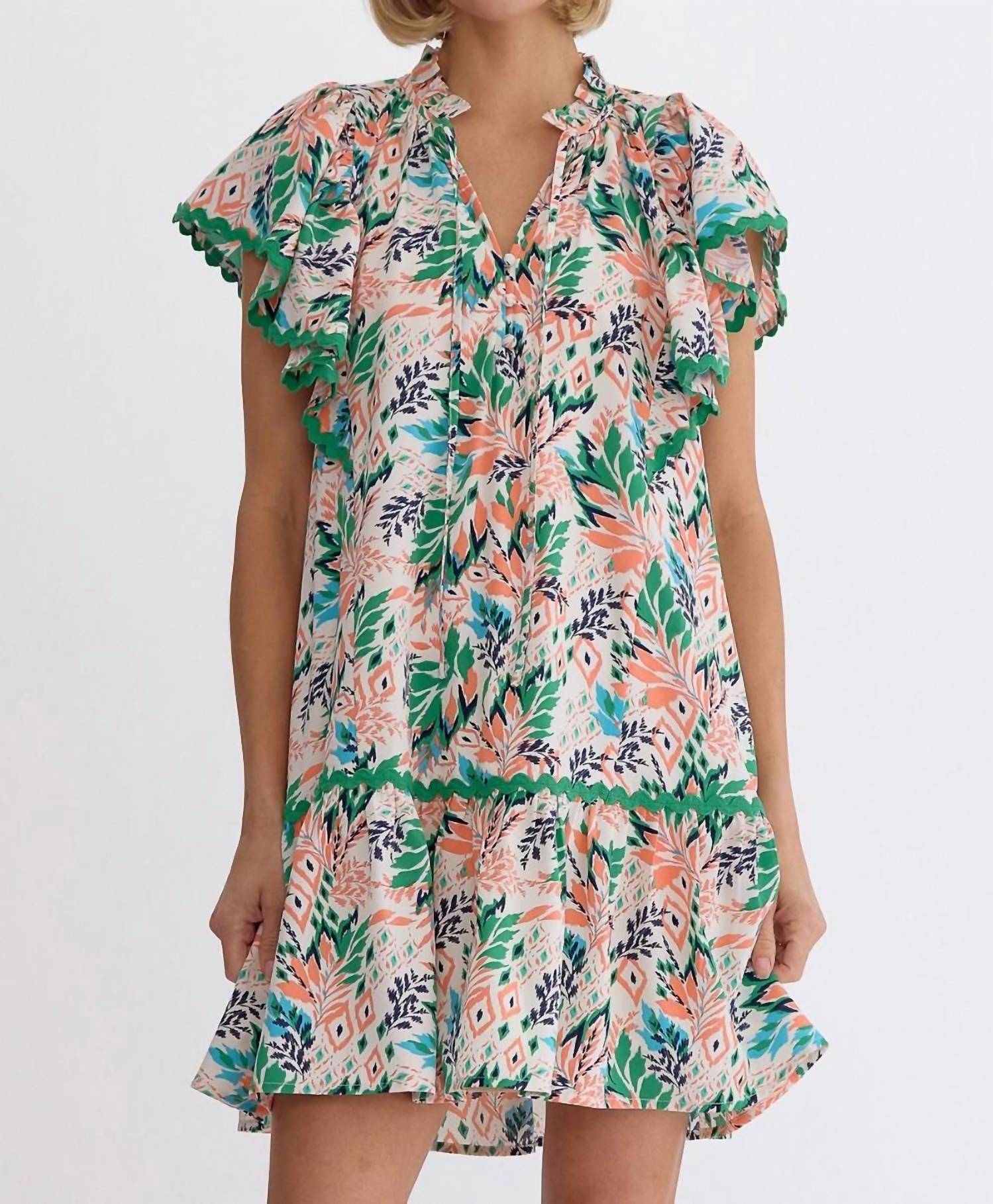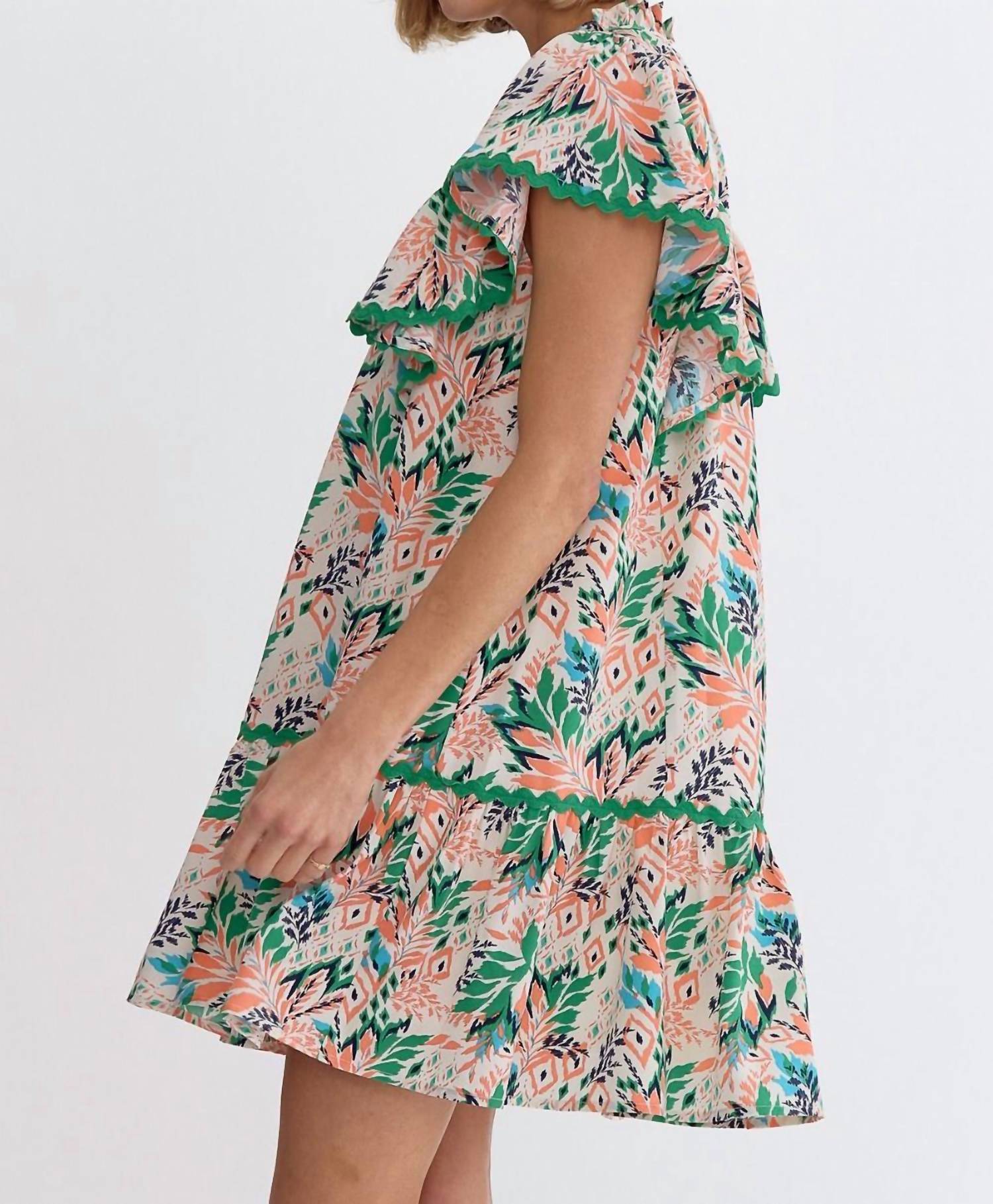 O tipo de vestido prático e elegante que você vai usar em todas as estações. Desenhado com um motivo tropical verde-claro e pêssego. Possui babados divertidos e um charmoso acabamento em tule. Apresenta um decote em V charmoso e mangas esvoaçantes com babados. Confeccionado em tecido leve e trançado. 95% poliéster, 5% elastano. Tamanho real. Caimento confortável e solto.